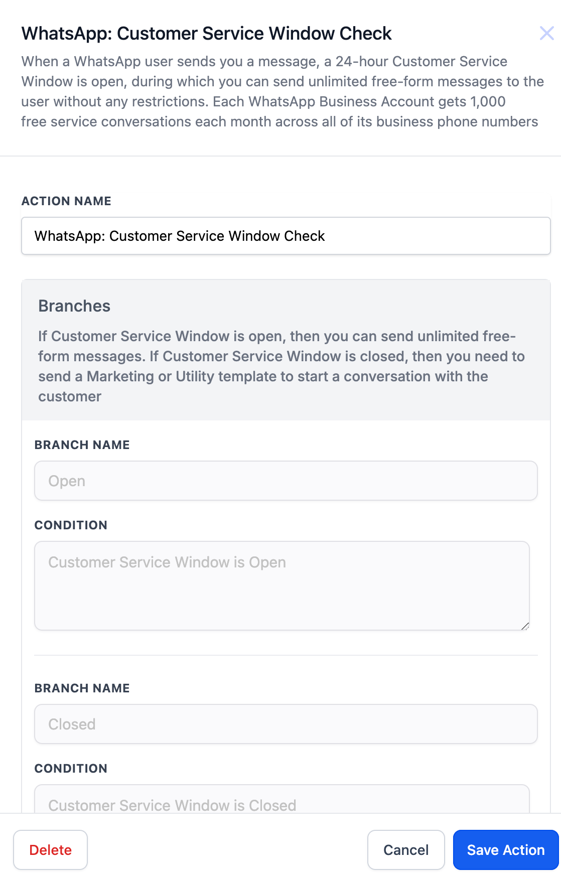 The WhatsApp Customer Service Window Check action allows you to check if a customer service window is open before sending free-form messages. When the window is open, businesses can send unlimited free-form messages for the first 1,000 service conversations each month at no additional cost. This feature ensures that you’re utilizing the open window to communicate with customers effectively, avoiding additional costs.