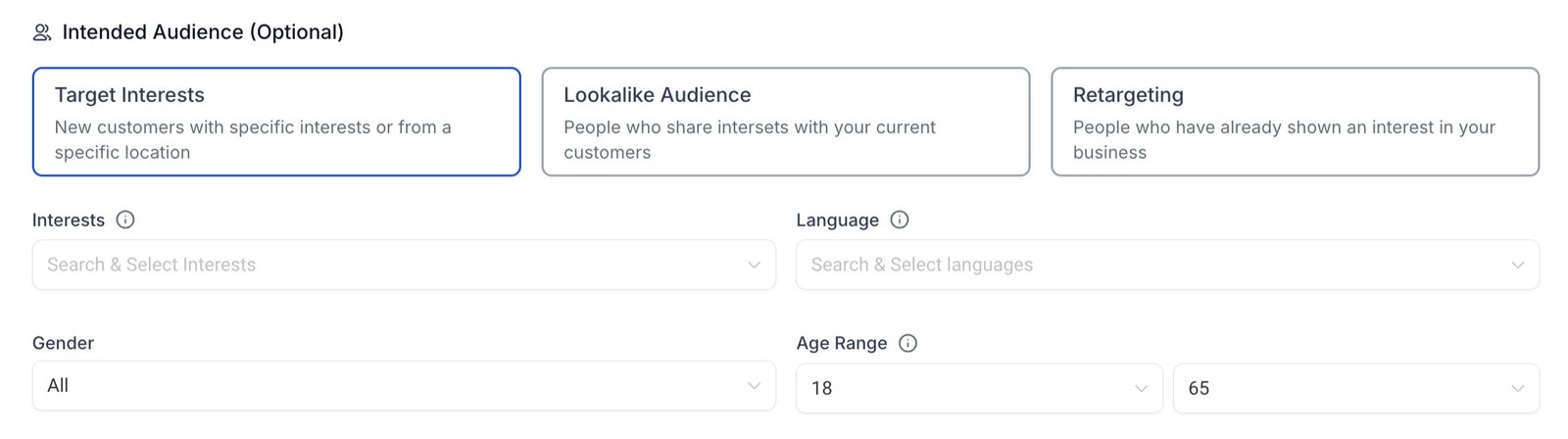 1. Target Interests: This one refers to new customers with specific interests, language, gender or Age range. Dropdown with interests of specific niche or industry can be selected for specific targeting of people who align with the one selected. Multiple Interests can be selected from the dropdown.