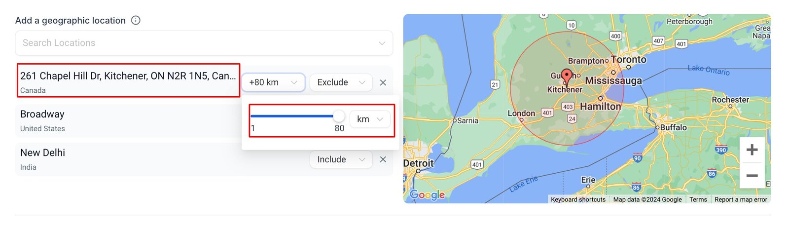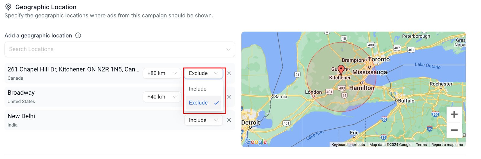 3. Another dropdown in line with the selected location, next to the radius dropdown is to select between “Include” or “Exclude” an audience. If you select “Include”, the audience in that location and radius(if defined) will be considered as target audience and if “Exclude” is selected, the audience of that vicinity will be ignored and not considered as the campaign audience and the location on the map will change the colour to Red.
