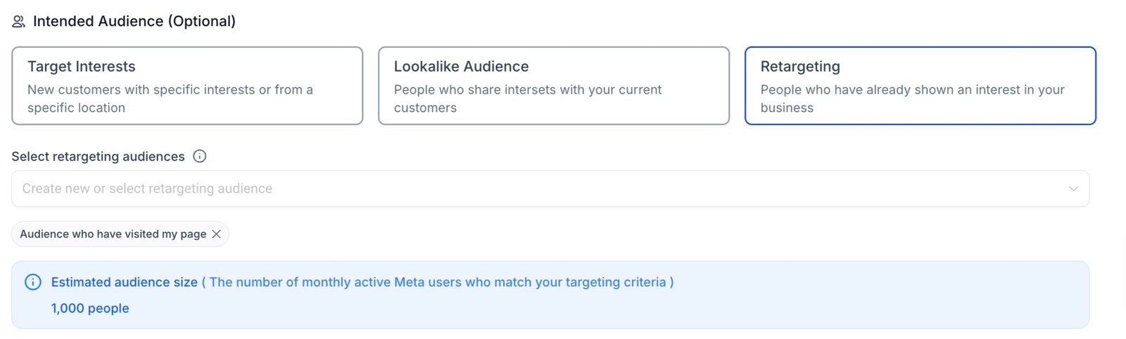 When the user selects Retargeting as the choice of intended audience, a dropdown will be present under it and the dropdown items will be the list of retargeting audiences created using custom audiences or imported from the connected ad account.