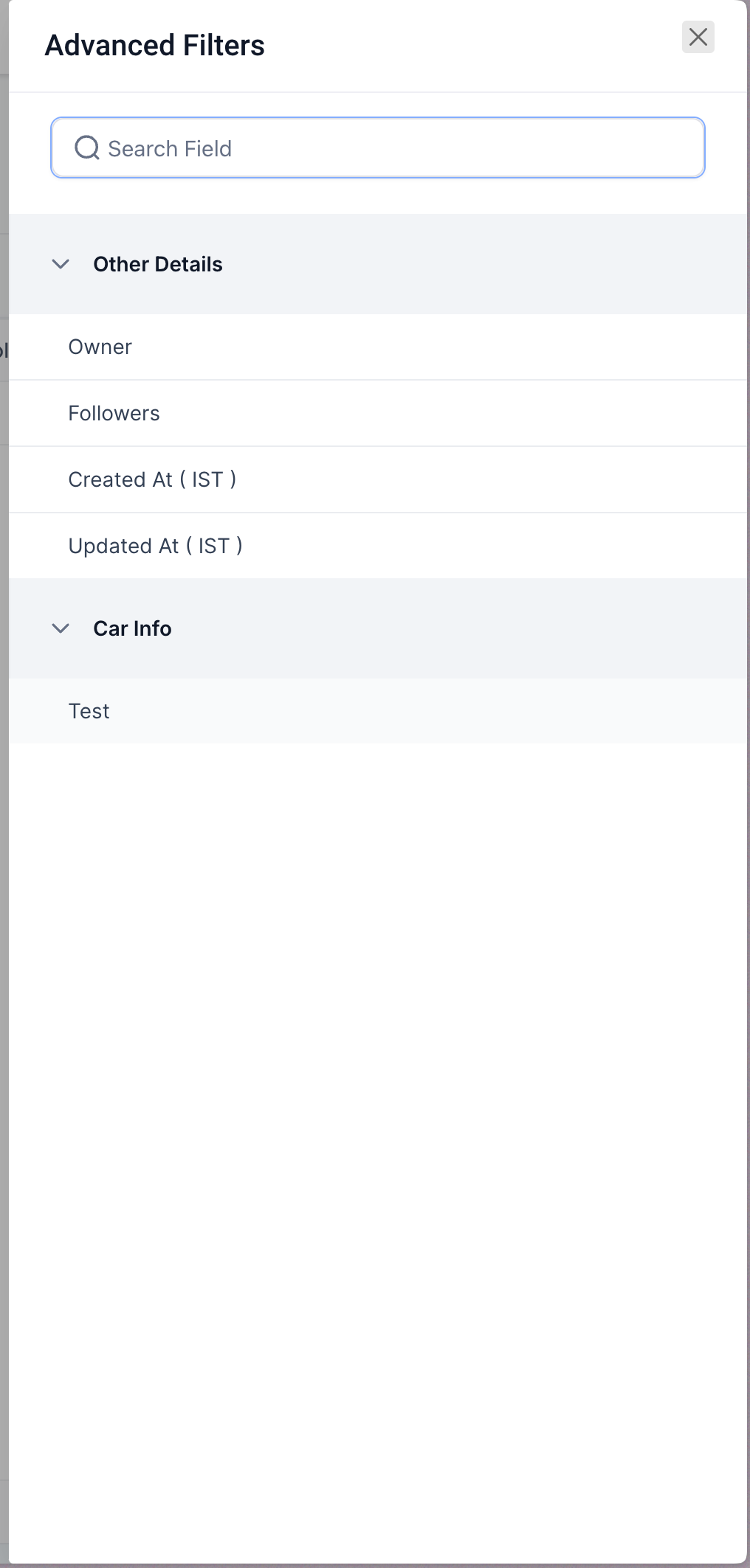 - Expand categories like Other Details, Car Info, and Price to choose fields.