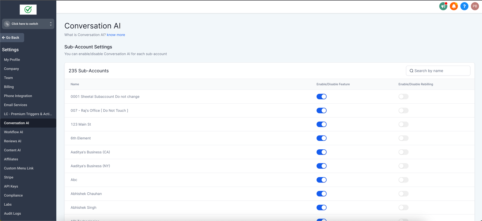Use the toggle, to manage the feature for each sub-account. Switching the toggle off will not let that sub-account use conversation AI and if the sub-account was already using conversation AI, it will stop any further AI generation in that subaccountEnable/Disable Rebilling