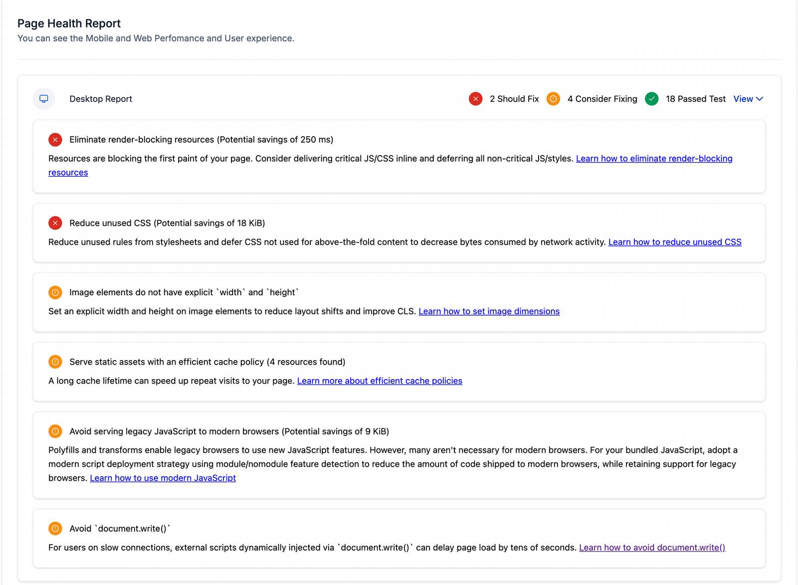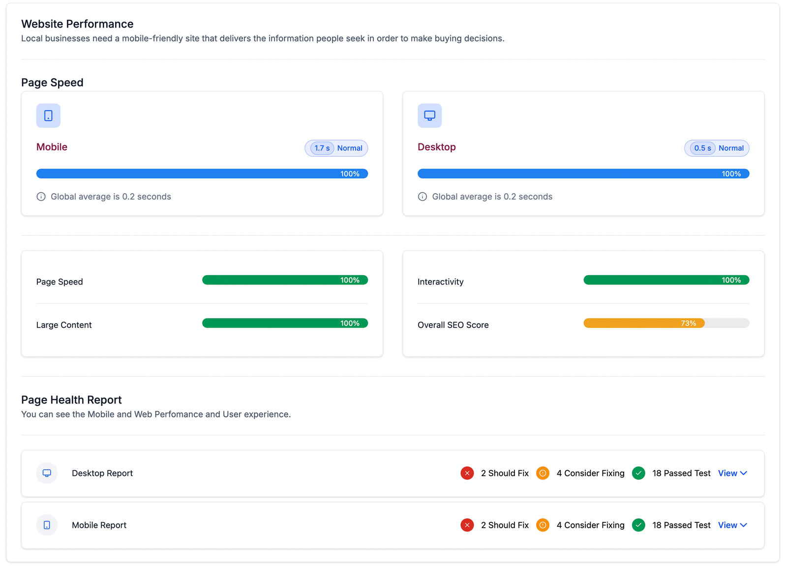 3. Comprehensive Page Health Report: Users get to access a detailed page health report covering both desktop and mobile versions of the prospect’s website. Agencies can help prospects Identify potential issues or areas for improvement to enhance overall website performance.