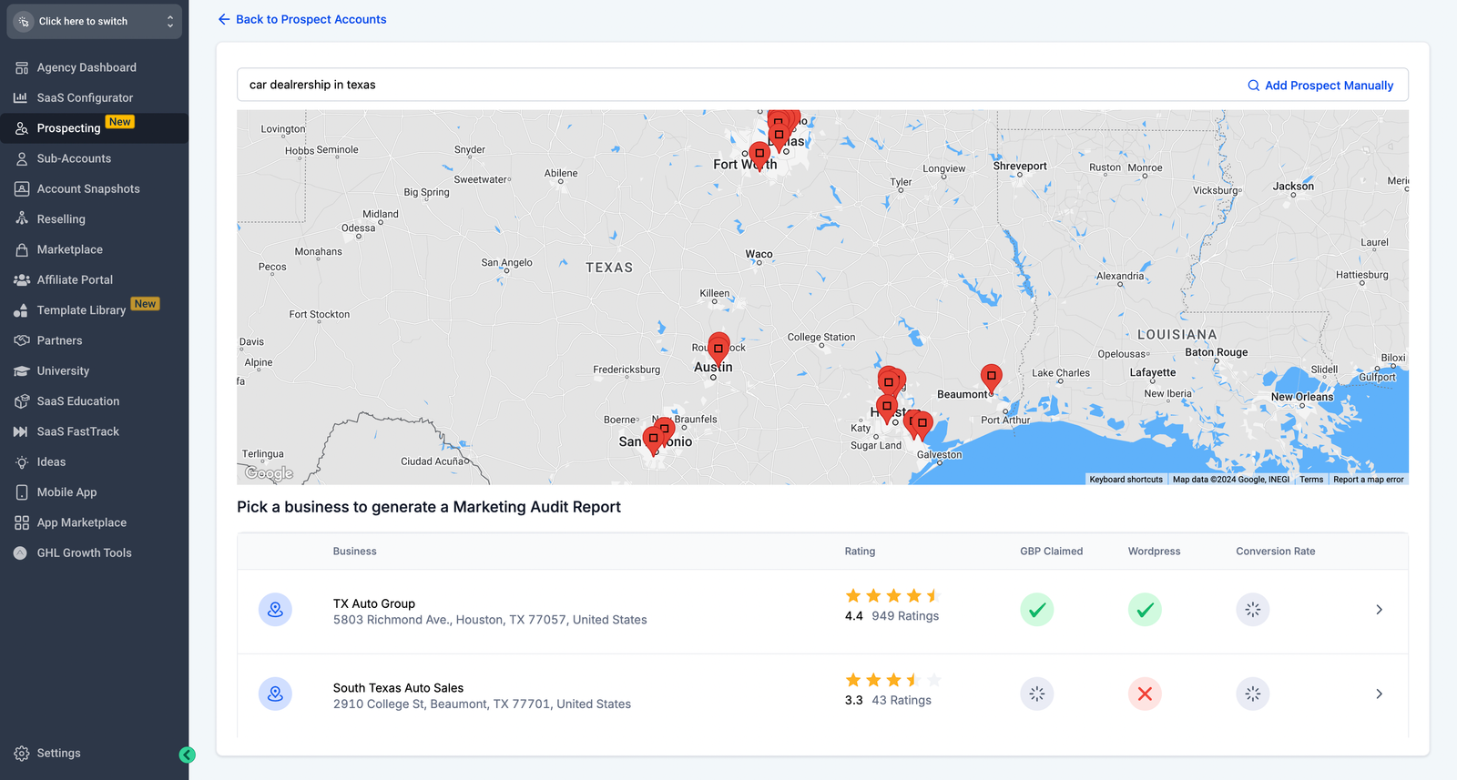 Simply go to Prospecting tab and click on Add a Prospect. Search for a prospect near you and click on Save Prospect. The Marketing Audit report gets generated for your prospect.