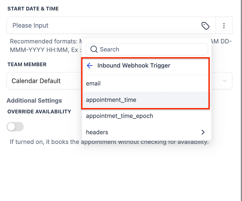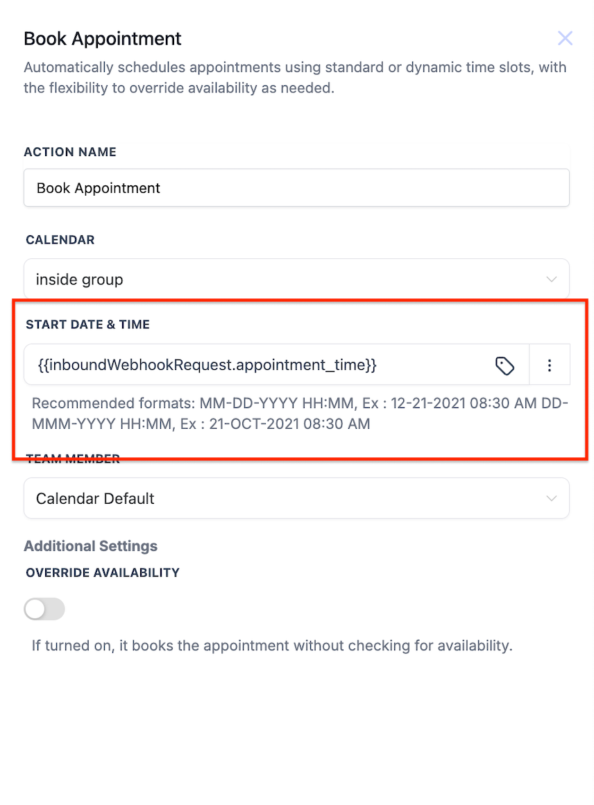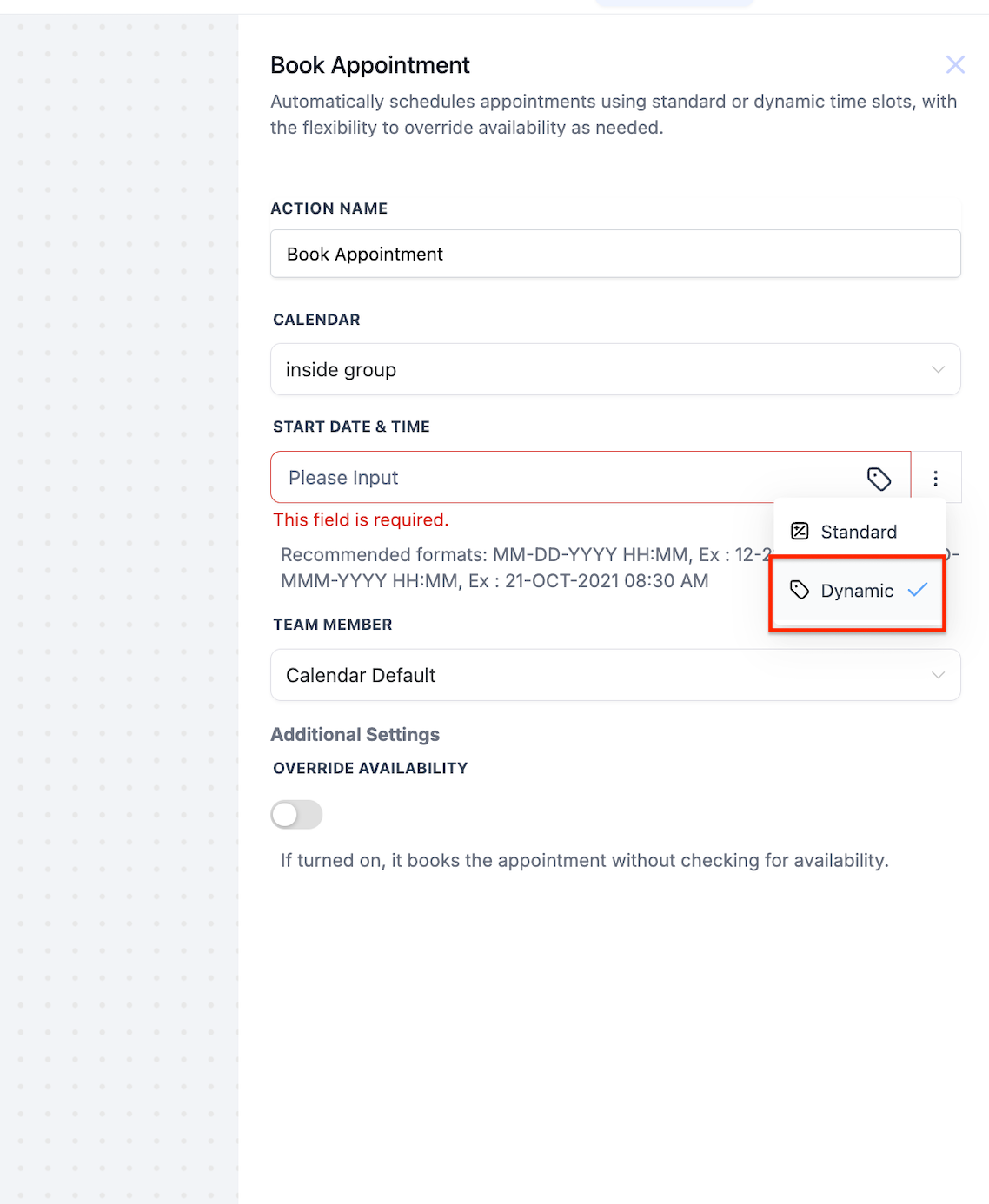 - Dynamic: A variable start date and time for different appointments. This can use data captured from inbound webhooks or custom values.