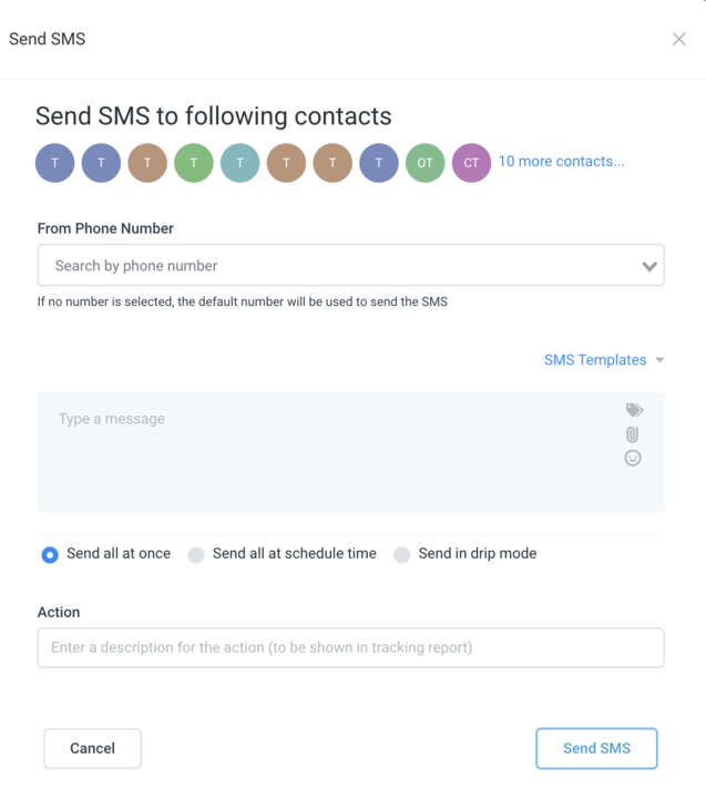 - Add further information about the scheduled time and the drip schedule in case of scheduling the SMS or sending via drip mode.
