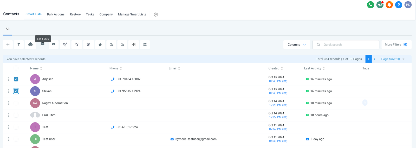 Select multiple contacts and the ability to send SMS to all the contacts in one go using Bulk SMS
