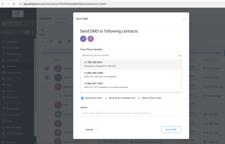Select multiple contacts and send SMS to those users