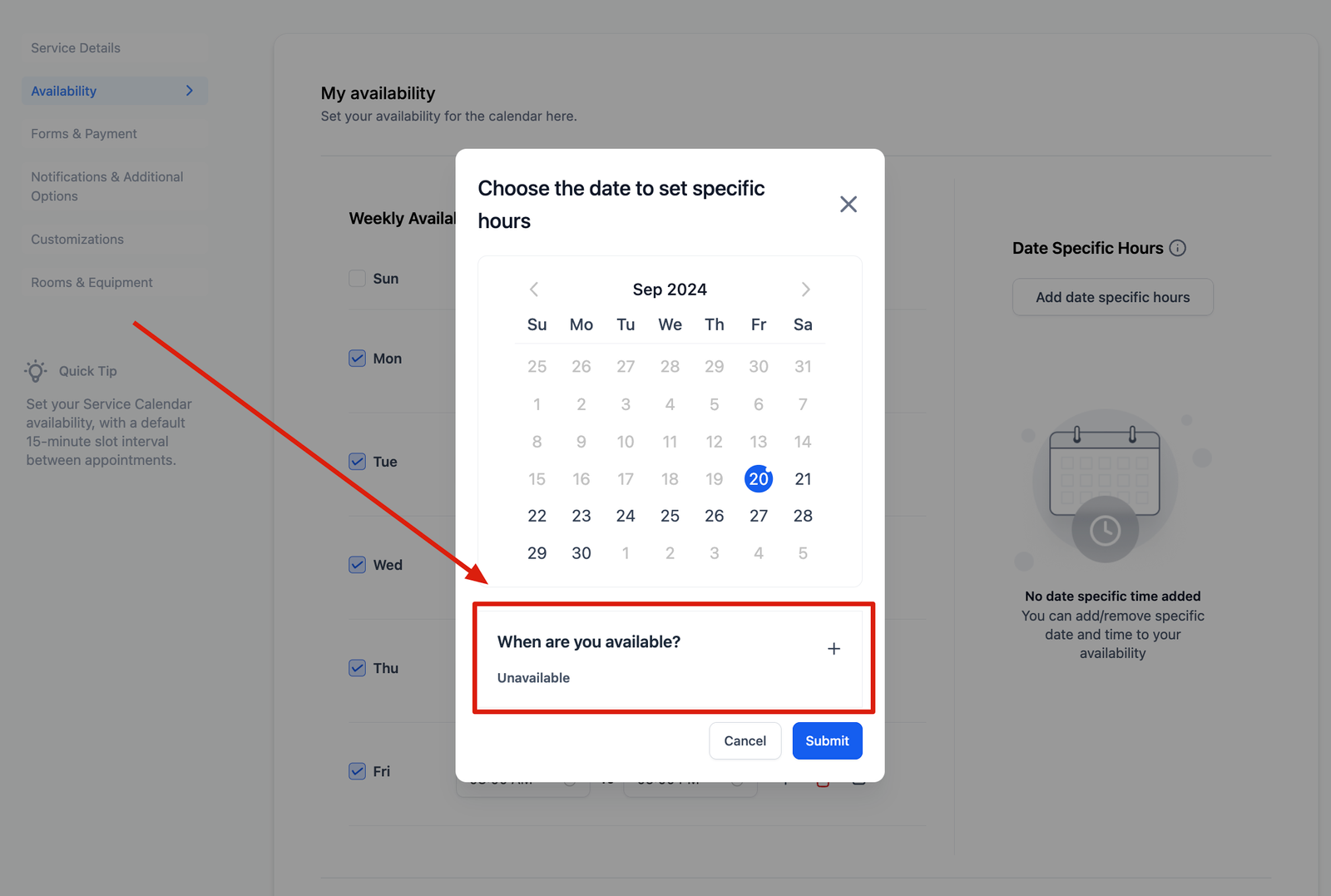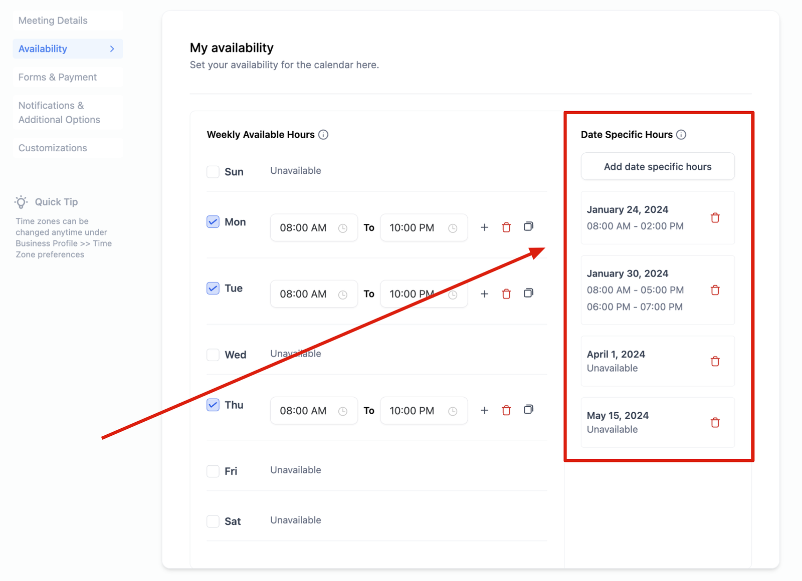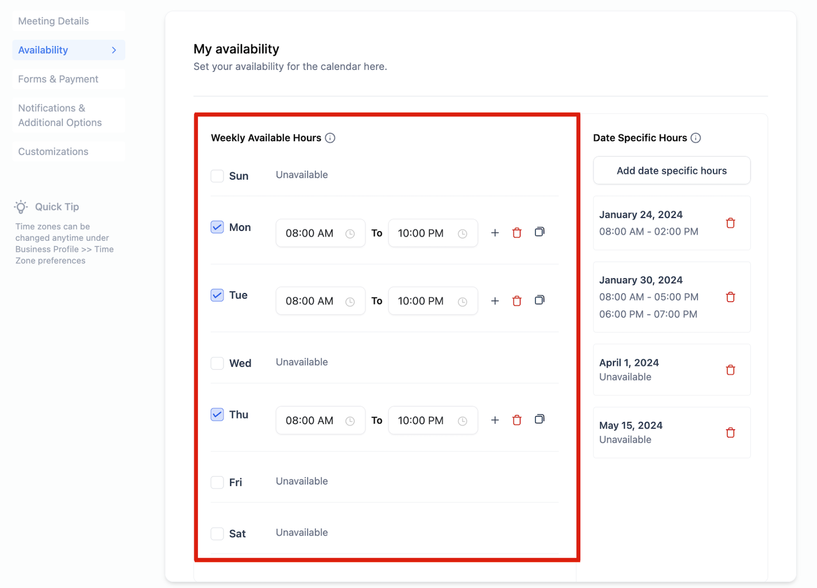 Date specific hours allow you to customize your availability or unavailability for specific dates. You can add specific dates and define hours applicable only to those dates.