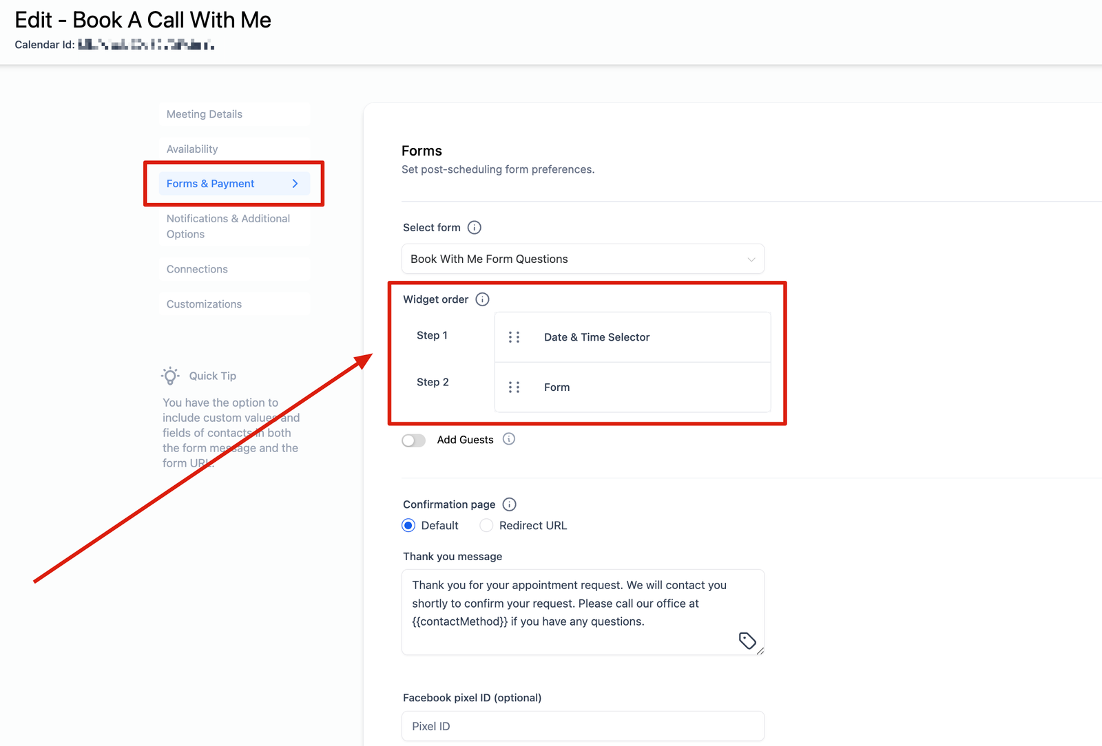 The Calendar Widget Reorder feature allows users to customize the order of steps in the calendar widget: the Date & Time Selector, the Form, and Payments (if enabled). Users can choose whether they want the Date & Time Selector or the Form to appear first, based on which the Payment step would be determined.