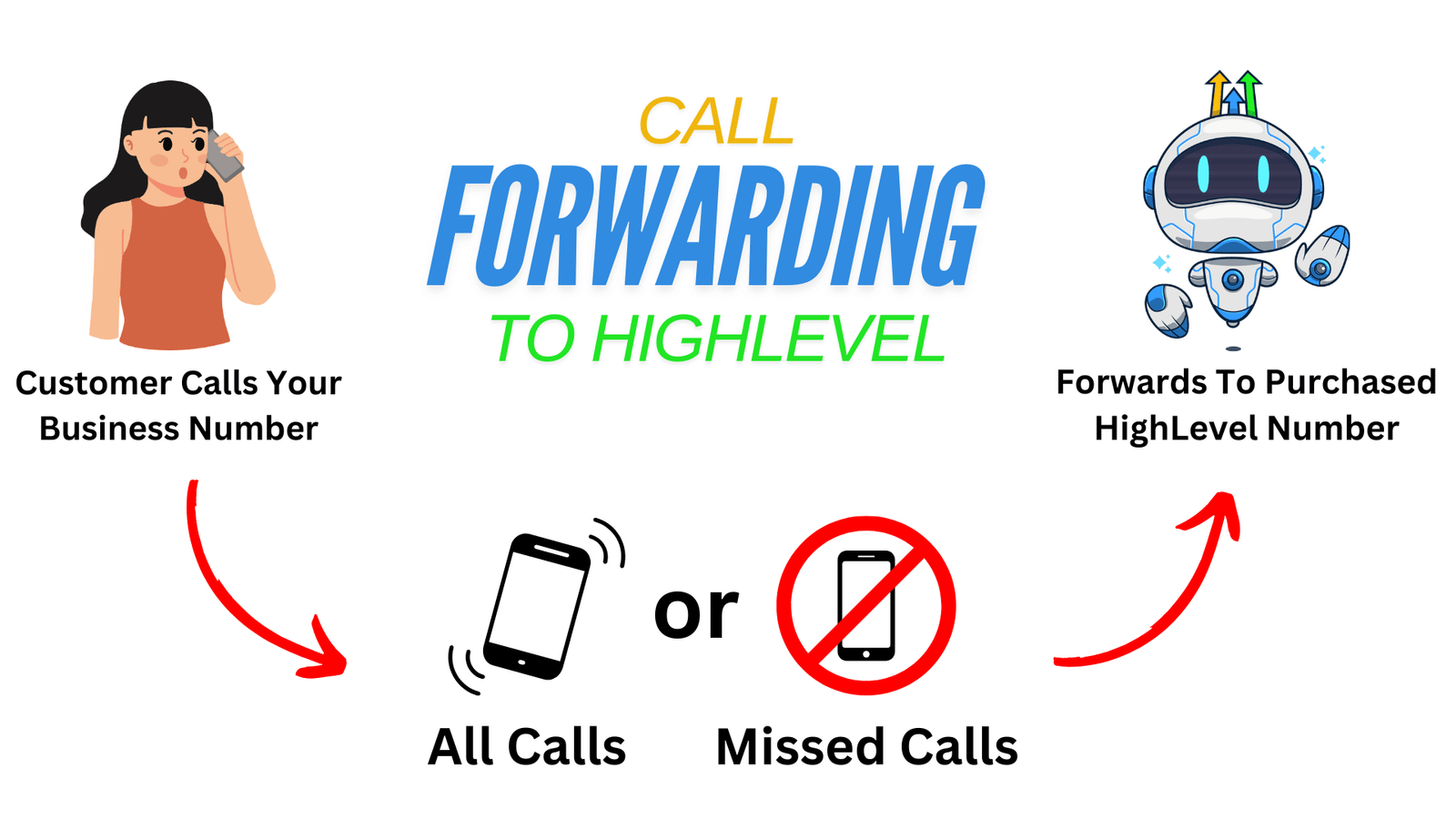 **21*1555-555-5555#) - To Forward MISSED CALLS (unanswered calls or calls that receive a busy signal): Dial **61*1 + your HighLevel phone number + # (e.g.,