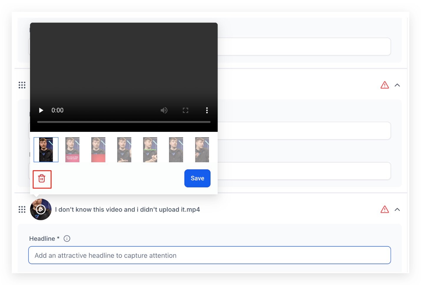 - Thumbnail of an uploaded video can be modified by clicking on the uploaded video and selecting the thumbnail you wish to be shown in the ad.