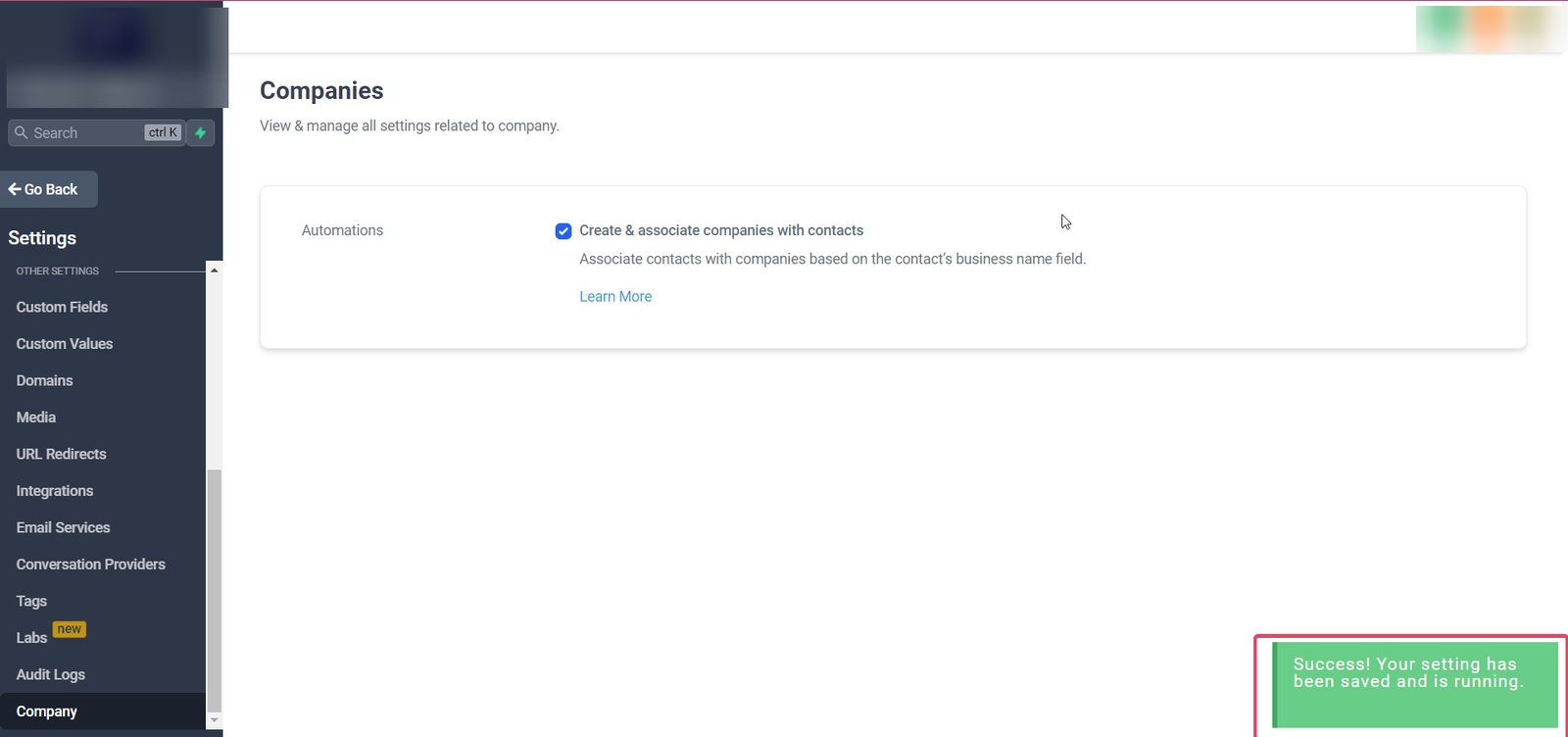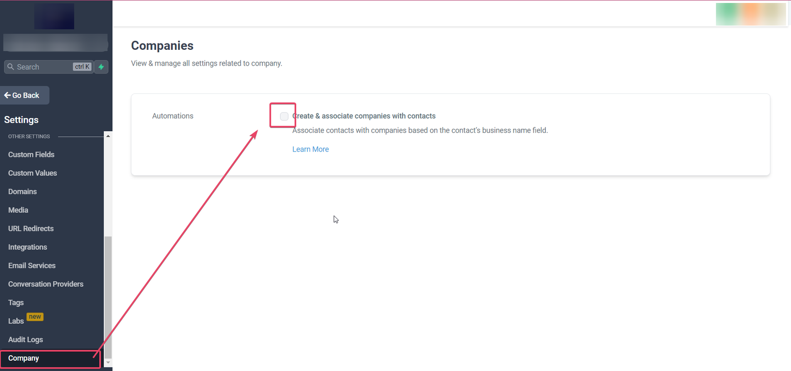 To access the Company Object Automation please head to sub account Settings> CompanyTab: