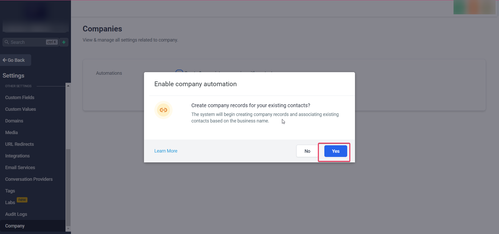 Upon clicking Yes, All contacts that have their Business Name field filled out in the General Info Section of their contact page will be added to a Company with the same name as the Business Name. If a company of that name does not exist, one will be created for them.