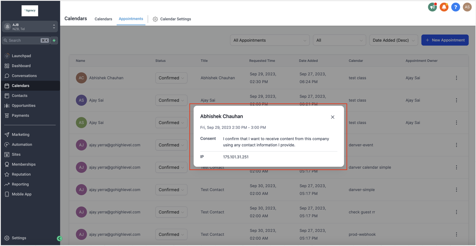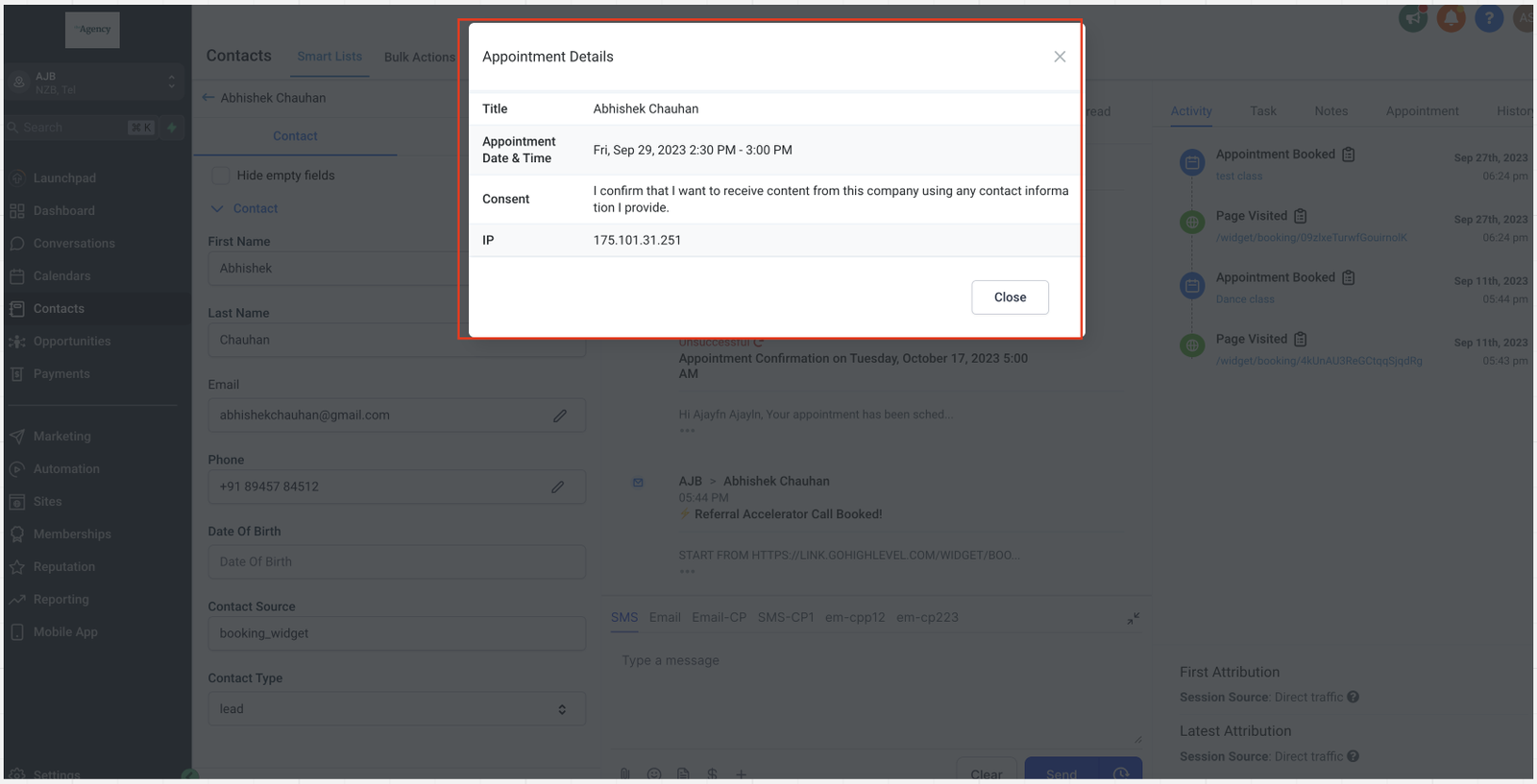 Contact’s Activity Tab: In the contact’s activity tab, you’ll notice an icon next to appointments for which consent was provided during booking. Clicking on this icon will reveal essential appointment details, including the consent text accepted by the contact, as well as the contact’s IP address at the time of providing consent.