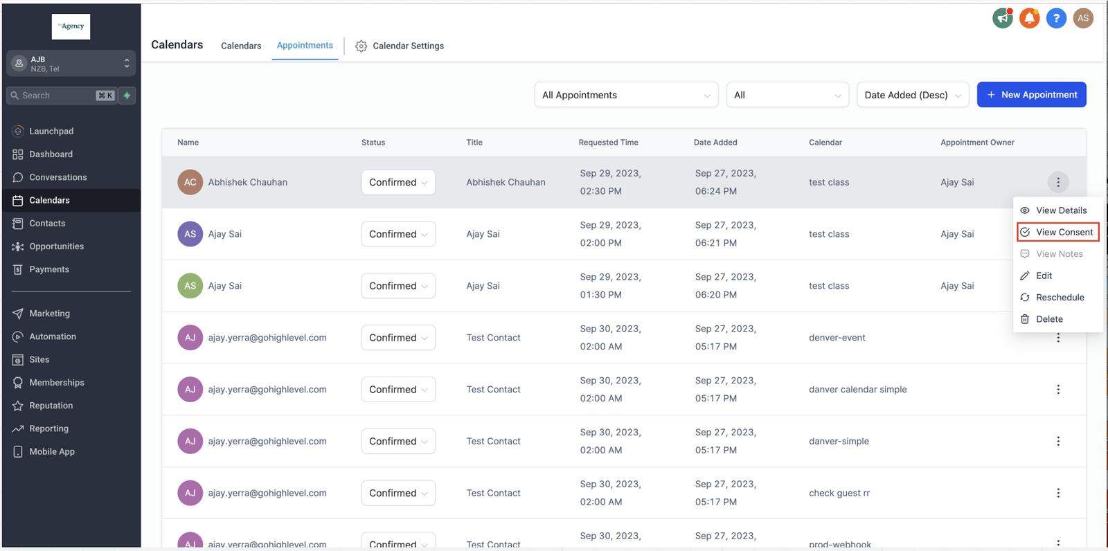 Appointment List View: Click on the three dots menu for the specific appointment, and select “View Consent.” This will display the consent information associated with that appointment.