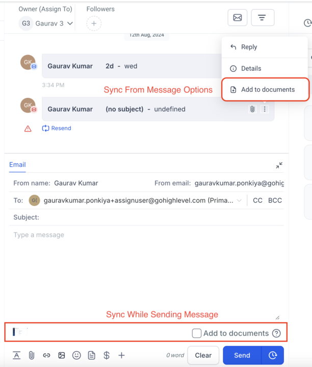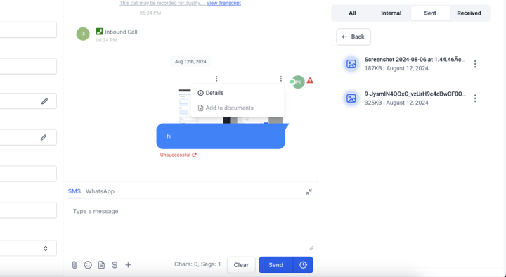 - Attachment During sending message: You can also sync attachments while sending SMS and Email messages by simply checking the “Add to Documents” checkbox.