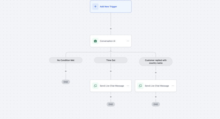While adding a conversation AI bot in the workflow action, now you can select Live Chat as an option there.