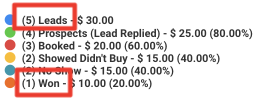 So if you like to track the leads who are in the NO SHOW stage, it doesn’t make sense to refer to the Funnel chart because that would mean that 40% of the leads who joined the Facebook Leads pipeline will move forward to the NO SHOW stage. In fact, it should be 20% instead of 40% because only 1 lead is no show. The other lead is marked as WON. When the lead is marked as WON, the number of leads on all stages will be increased by 1 because we assume the lead went through all the steps to purchase the product.