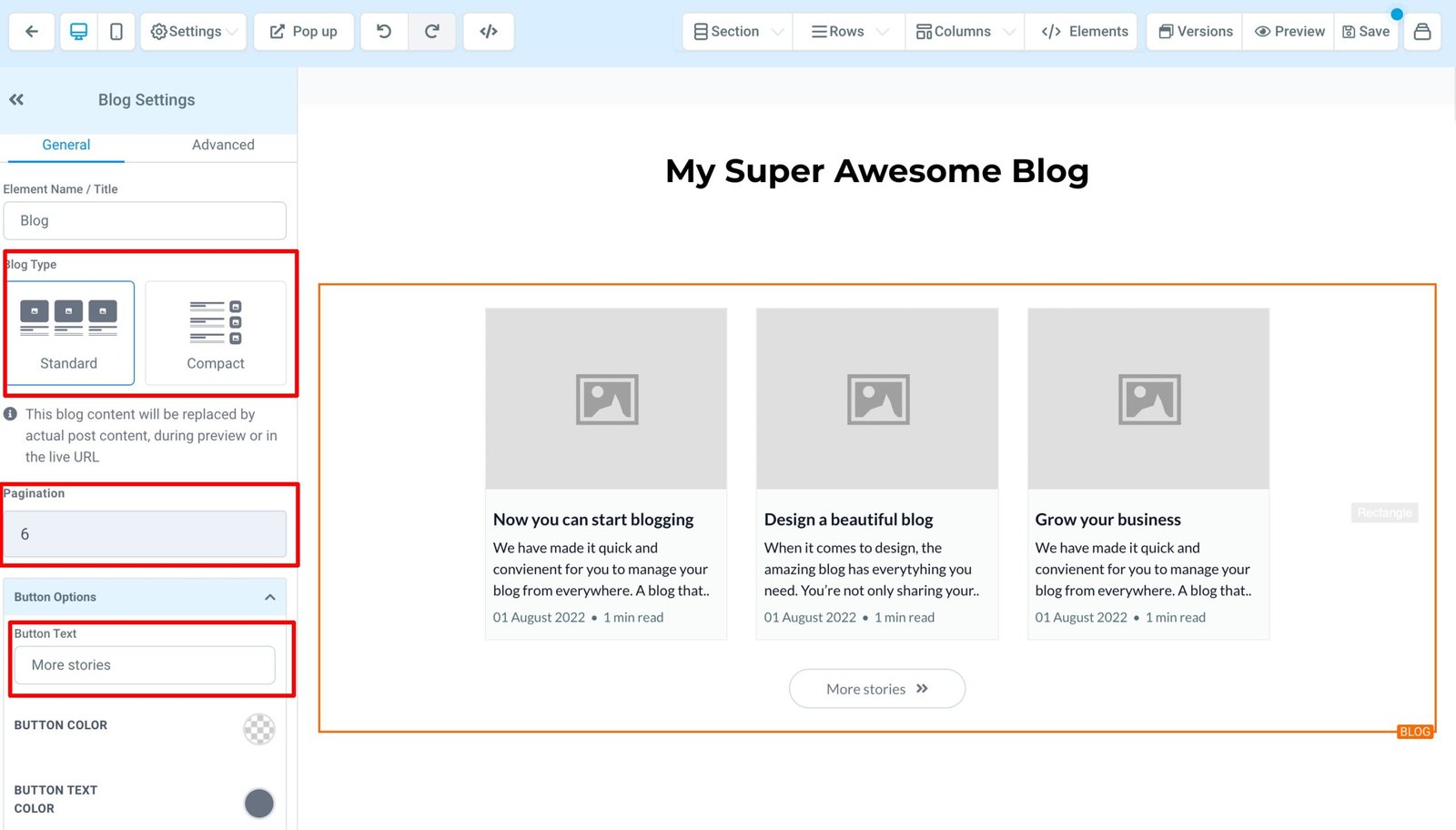 The “Blog Post List” element has several options. Blog type allows you to choose between “standard” or “compact,” the Pagination settings will enable you to select thetext will number of blog posts visible on the page, and the button options allow you to edit the button textwill, enable