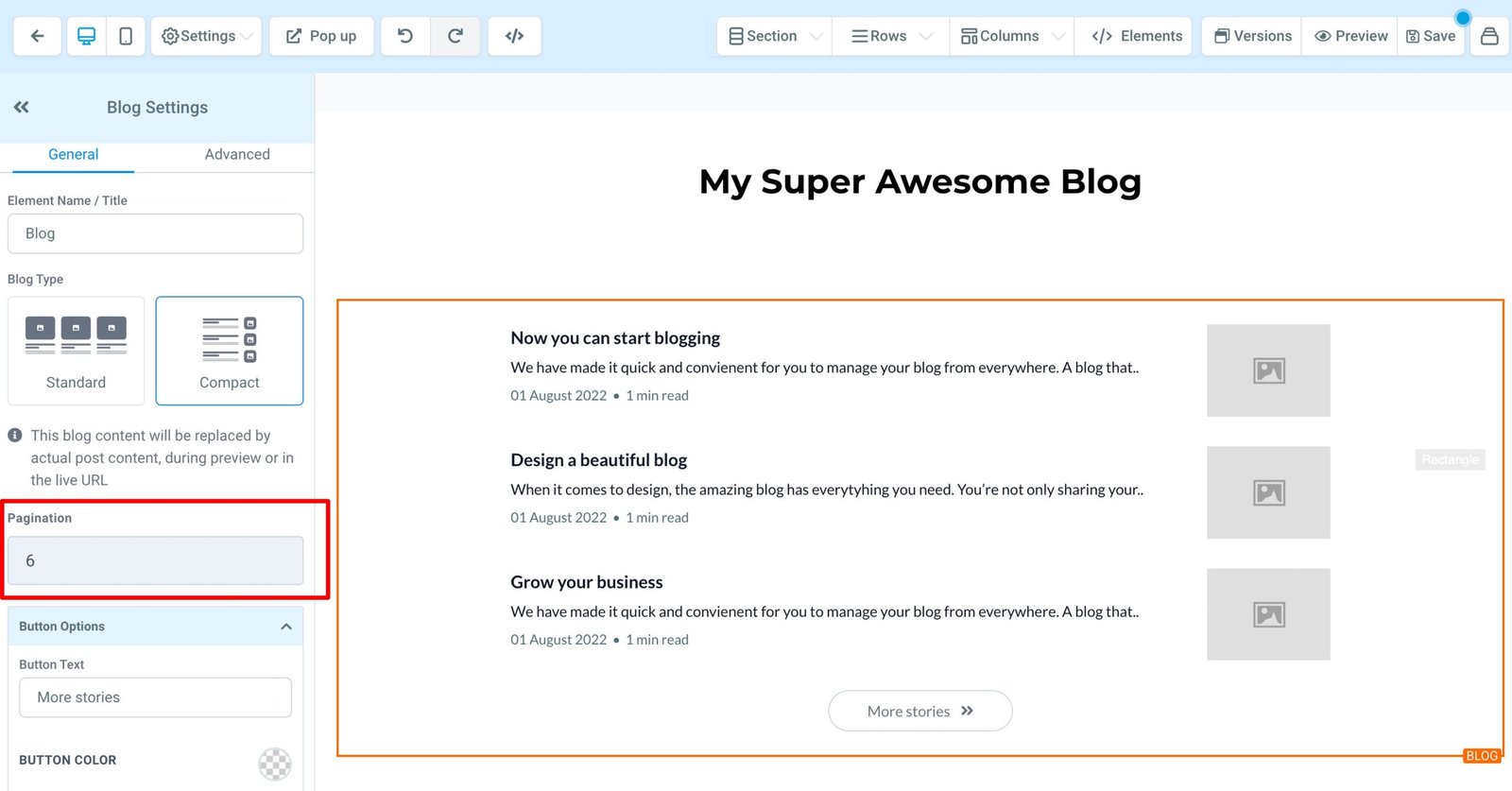 The Pagination settings allow you to select the number of blog posts visible on the page, and the button options will enable you to edit the button text. We would recommend keeping it to 6 or 9 blog posts.