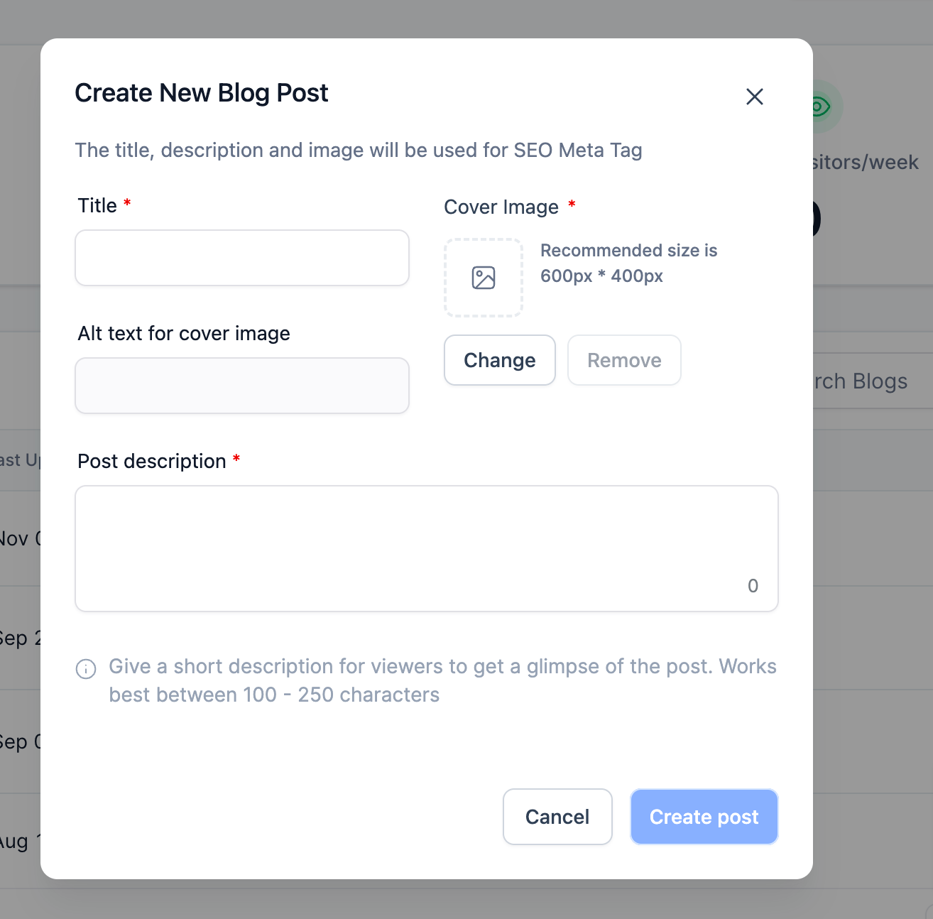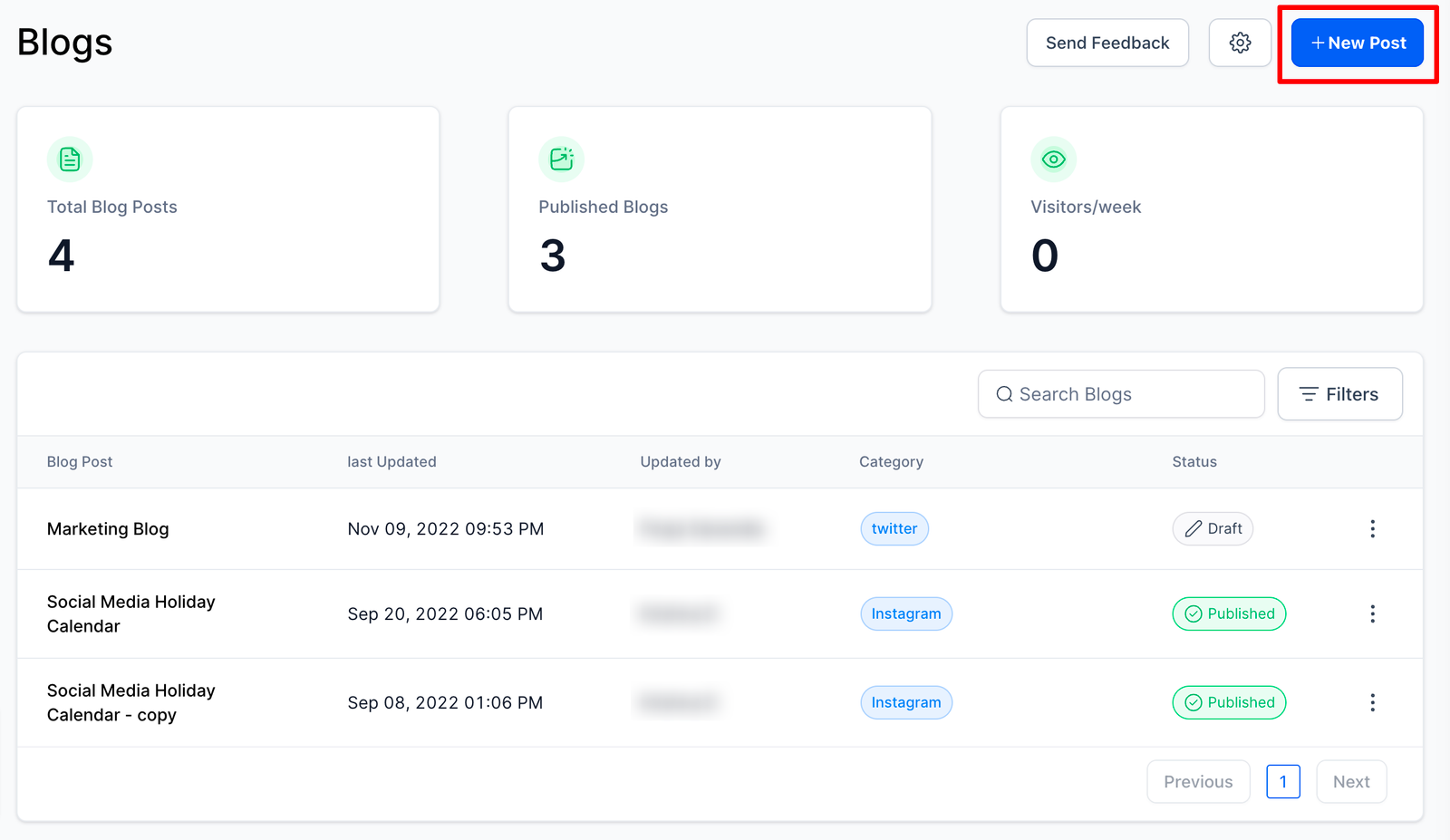 1. From Sites > Blogs, Create a New Blog Post with a Title, Description, and a Blog Post image