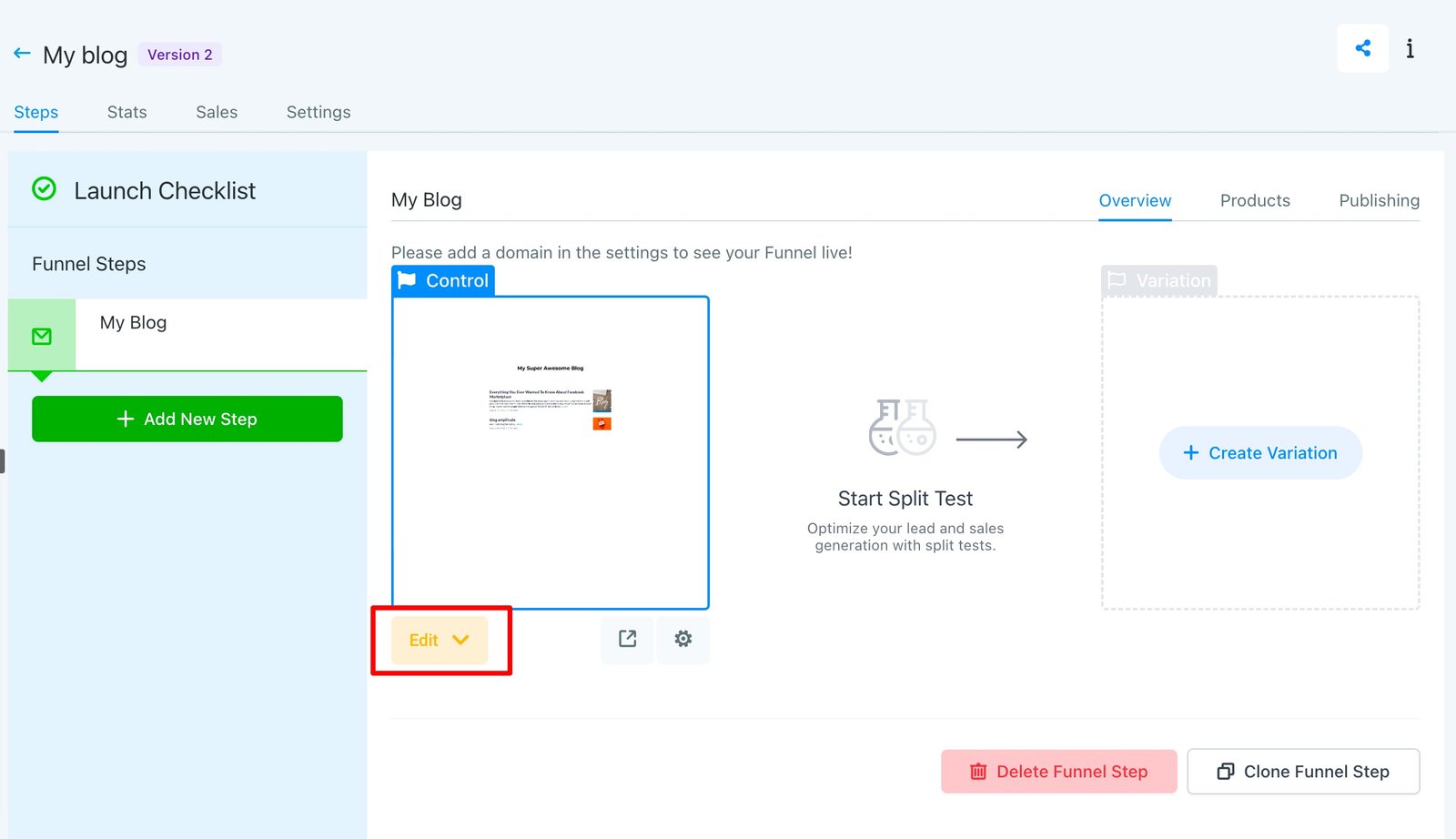 2. Once the funnel step is added, go to the edit button to land on the editor