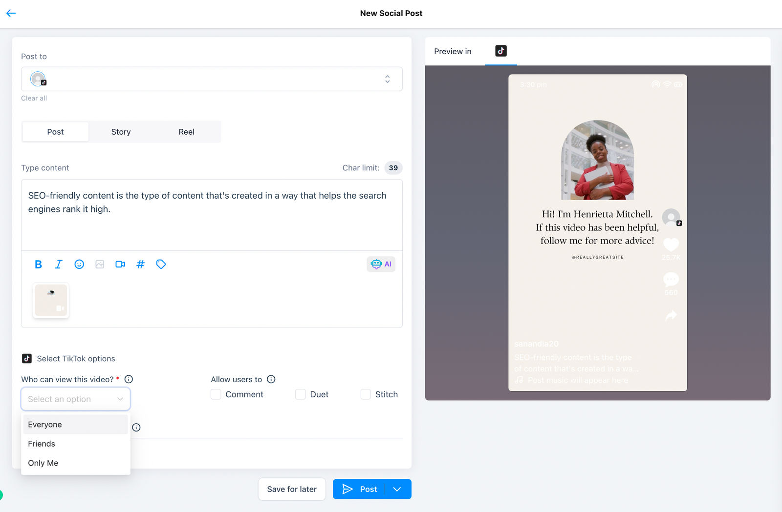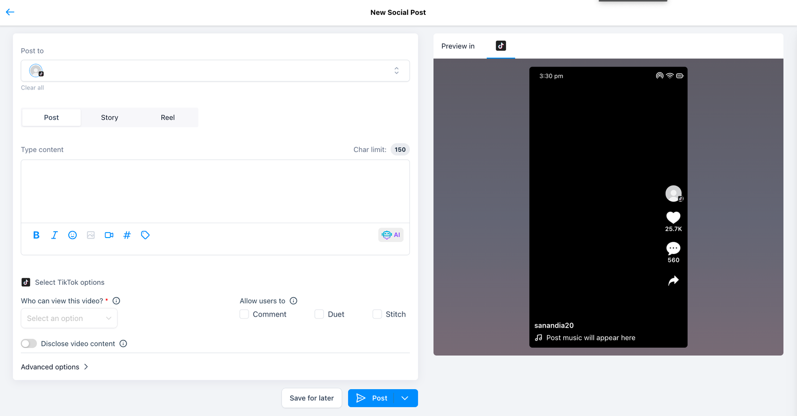 2. In Social Planner, Create new post by selecting the social Tiktok Personal or Business Account
