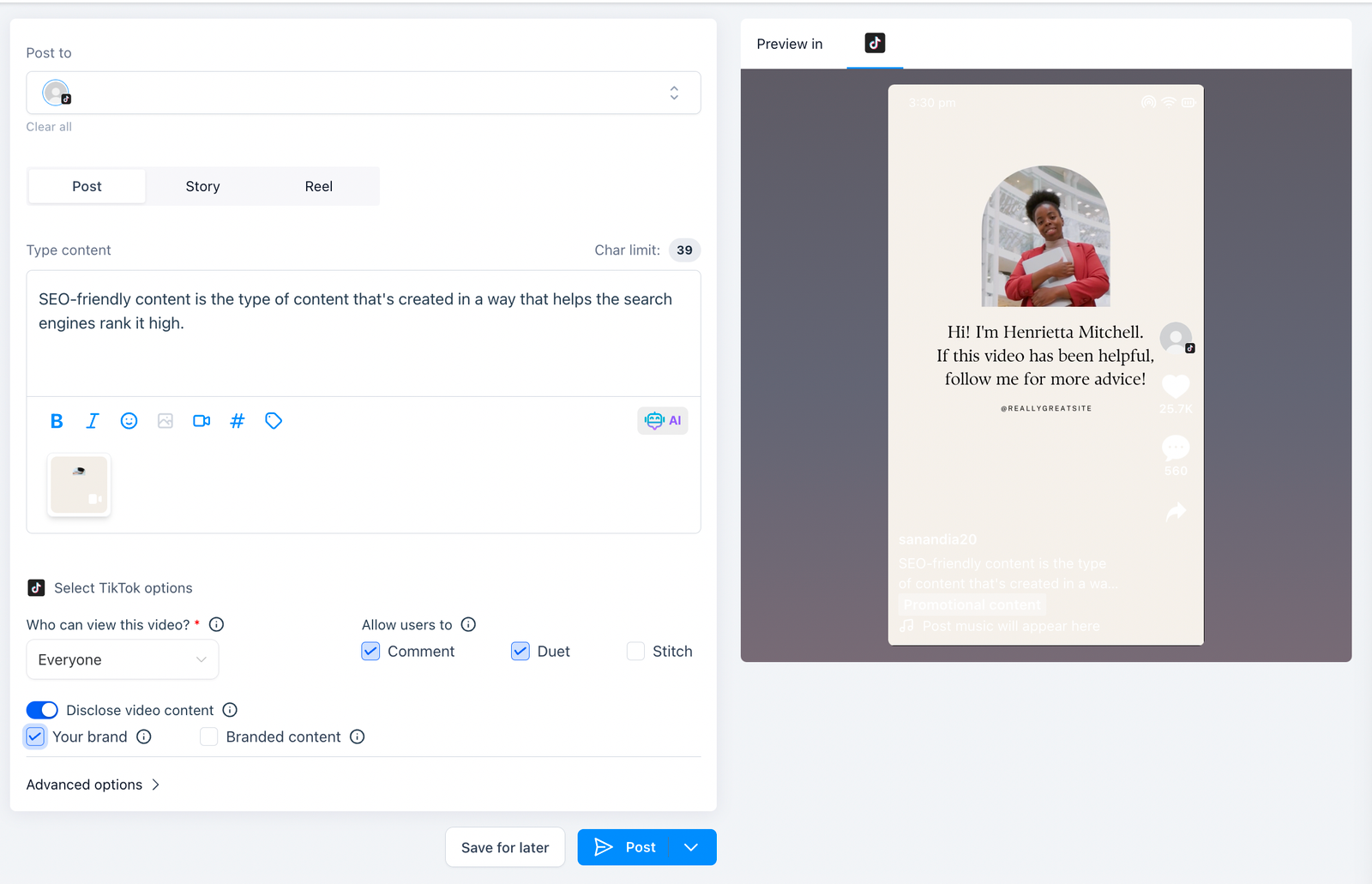 Create, customize, and schedule your content at your convenience for maximum engagement. Elevate your TikTok experience – start posting effortlessly today!