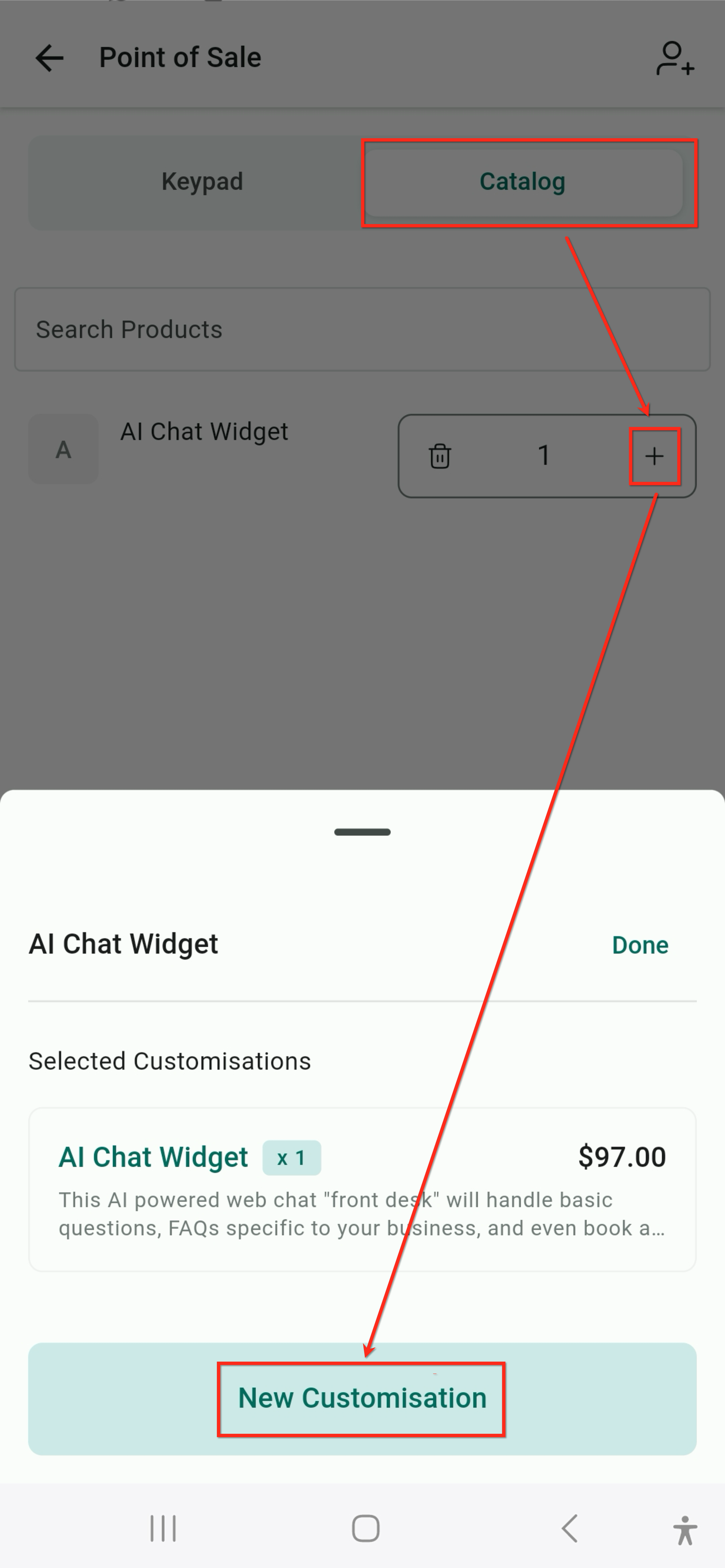 - In case you want to add a different variant combination of the same product, you can tap on “+” on the quantity counter on the catalog page, and tap on new customization.