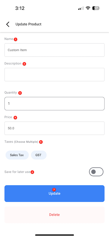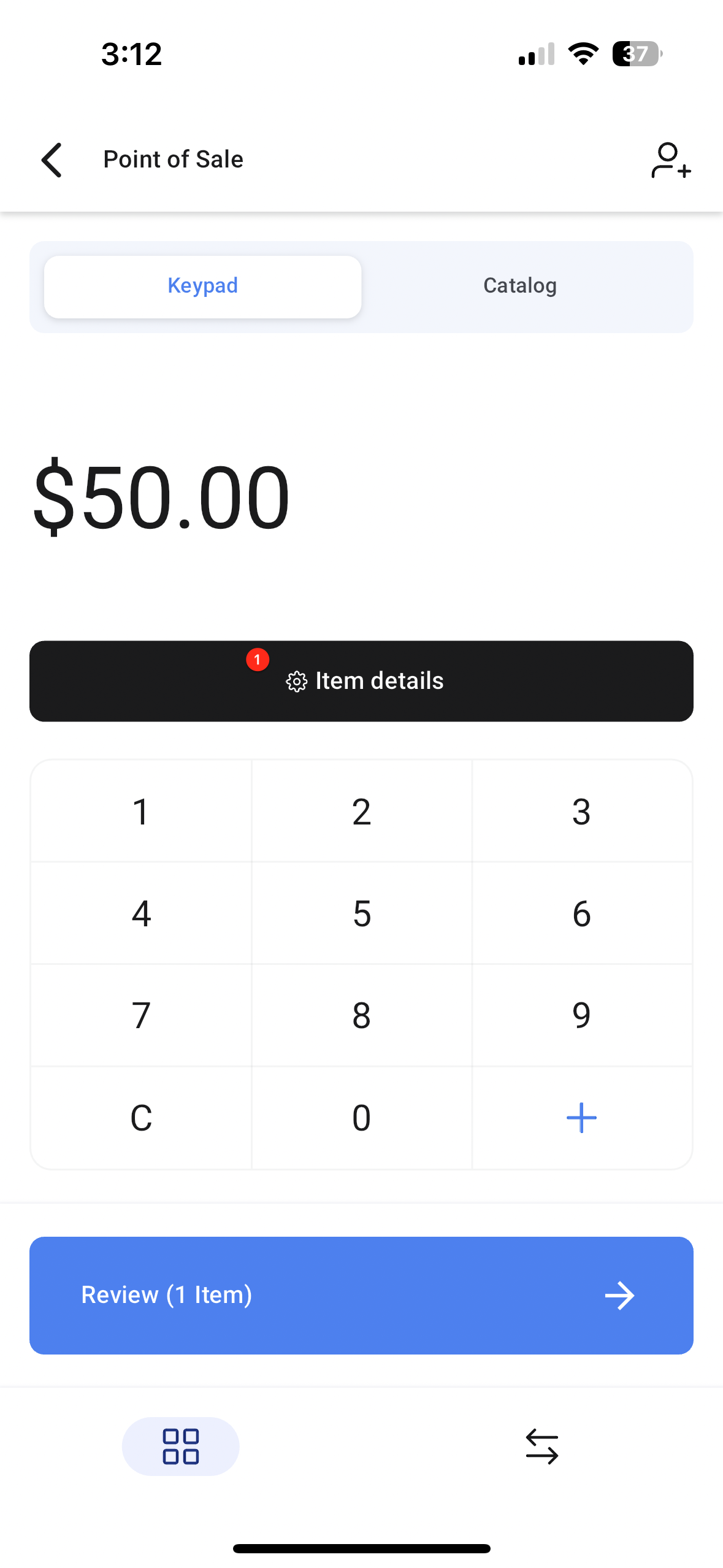 – You can save a custom item to your catalog if you would like to use it again in the future. This is accessible by tapping on the highlighted Item Details button below the amount under the Keypad tab and toggling on Save for later use.