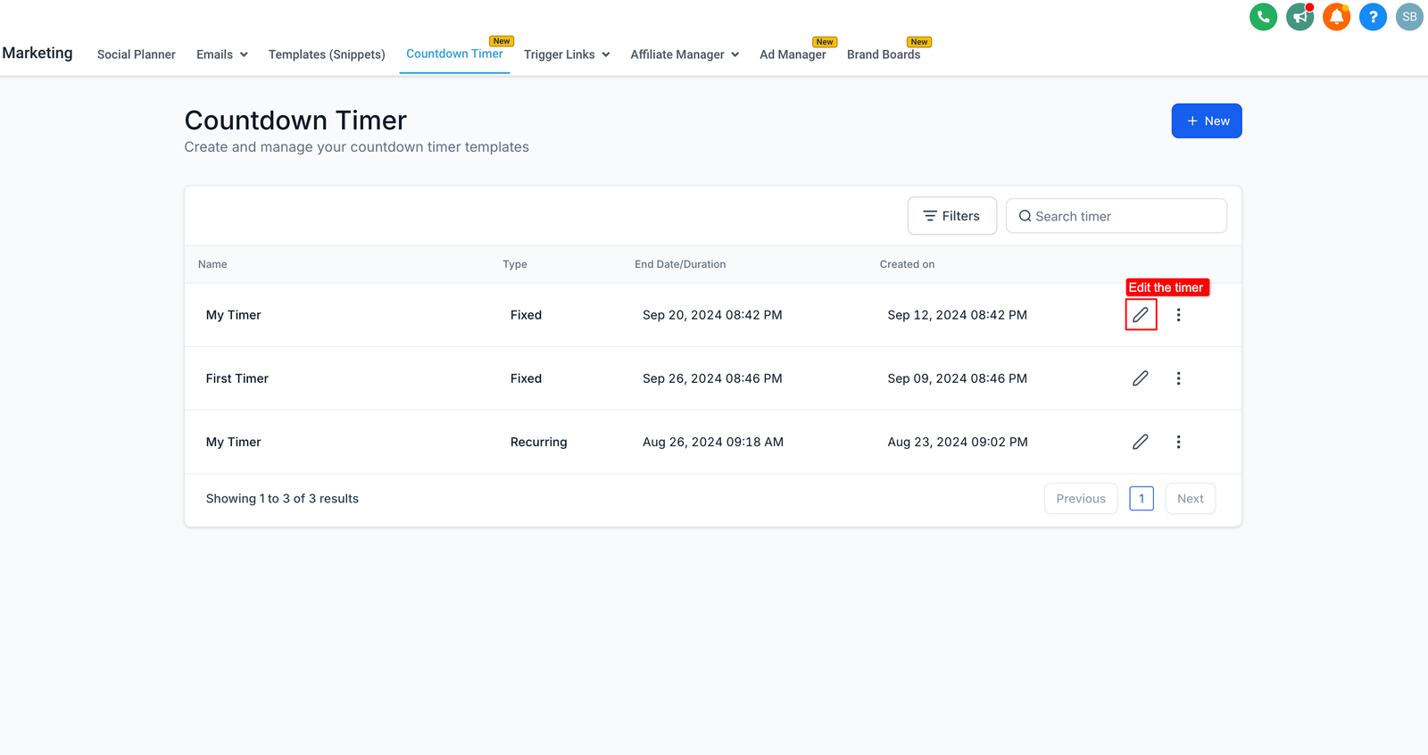 • Search for the specific timer you want to edit. Once found, click on the Edit button.