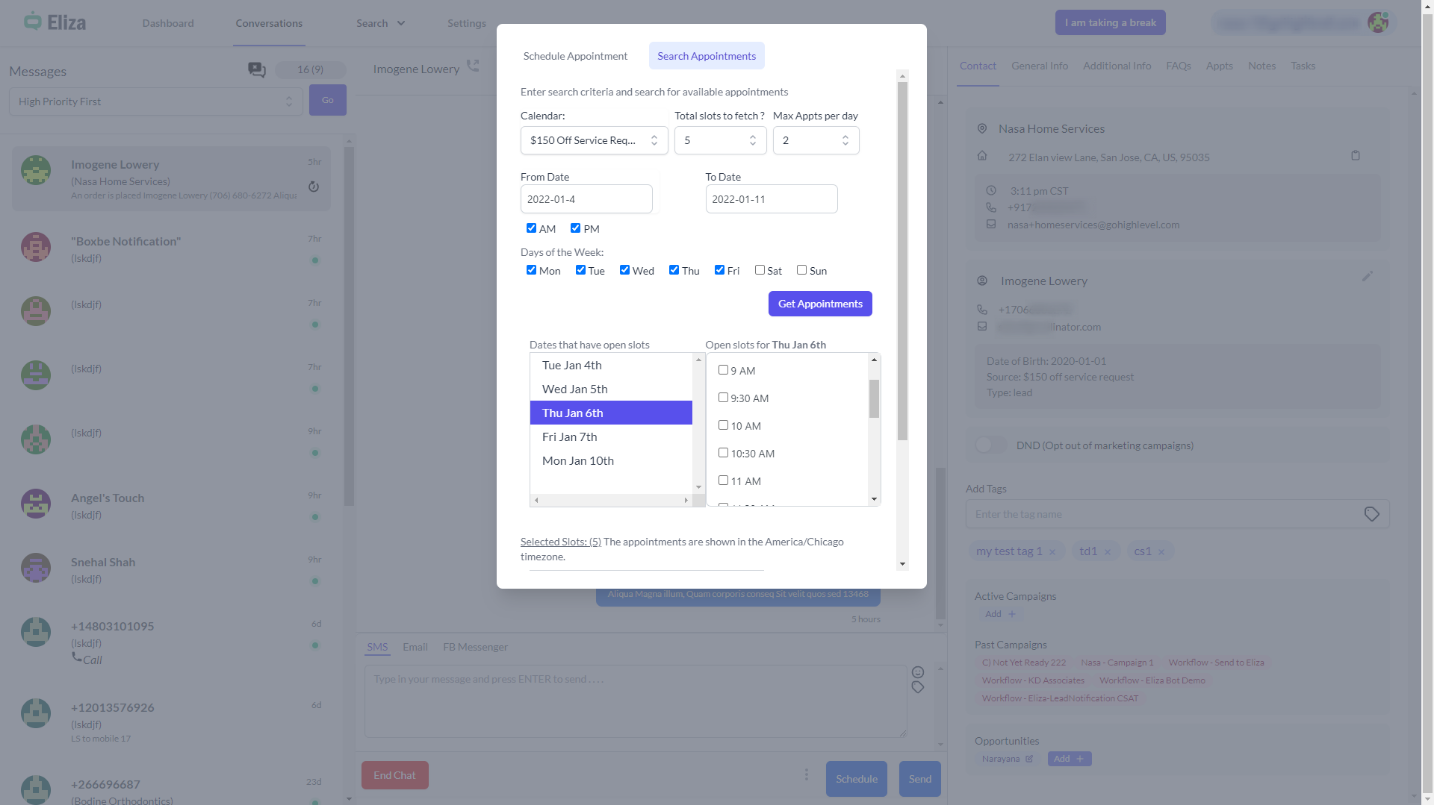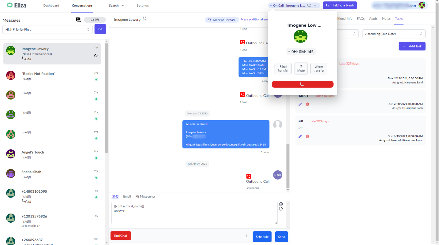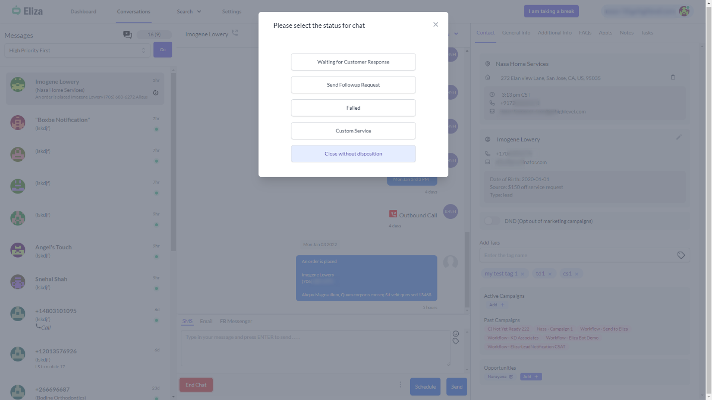 Alternatively, if the agent wants to see only these contacts, they can filter for “Send to Eliza” and respond immediately upon arrival.
