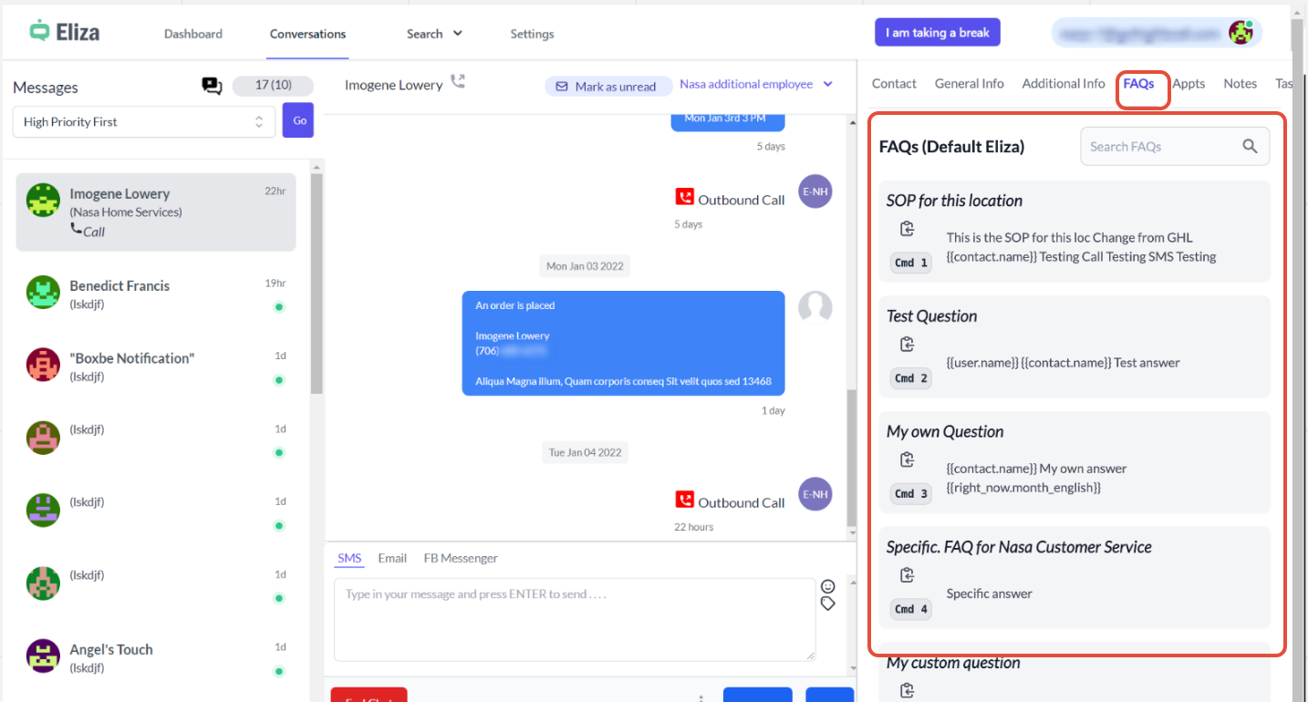 • Displays all the FAQs configured for the location. The agent can click the icon to the left of the FAQ answer and copy it directly to the reply box in the conversation. The agent can search on the FAQs section for faster results.