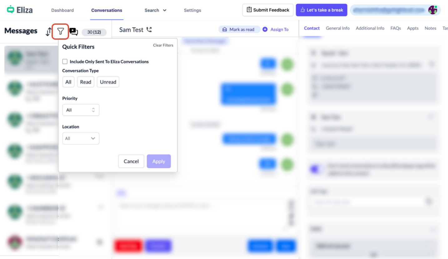 Messages can be filtered by Read/Unread/All, Priority Location, and contacts Sent to Eliza. There is also a way to sort the messages by High Priority First, Low Priority First, Latest First, and Oldest First.