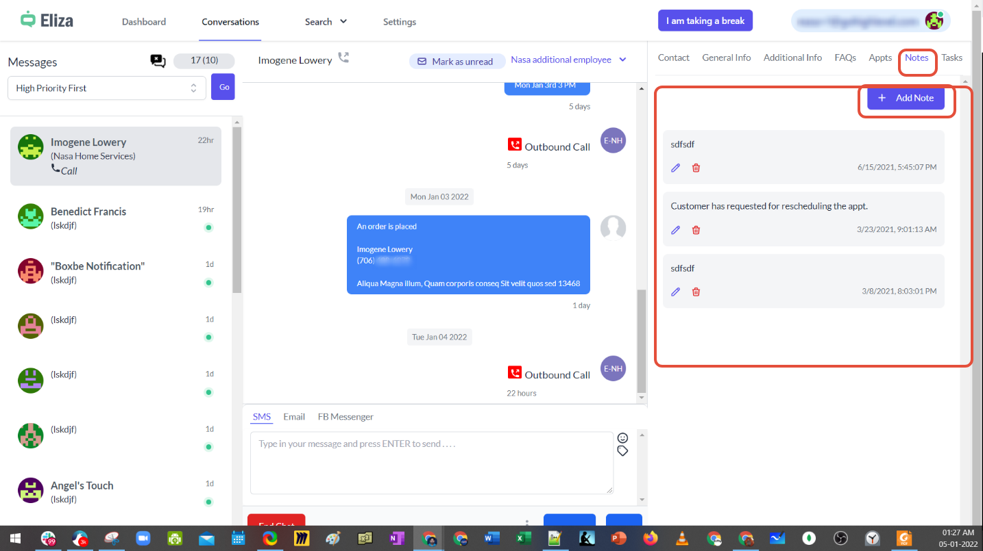 • Shows the notes added to this contact. An Eliza Agent can also add notes in this section.