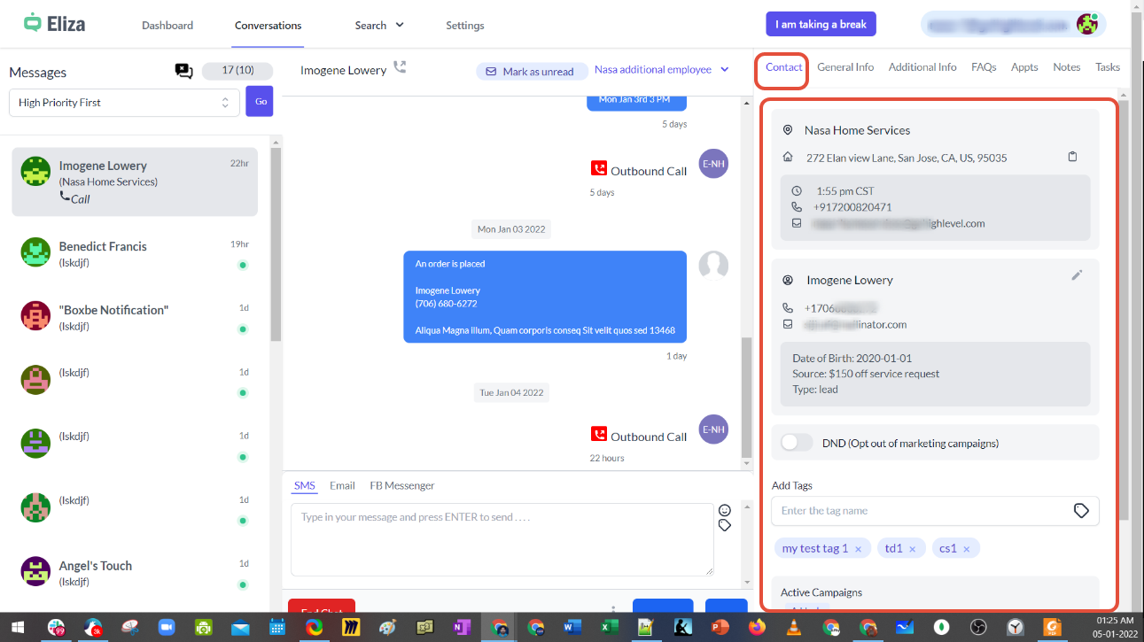 • This tab lists tasks created on this contact. Eliza agent can also create tasks for users on the HighLevel account.