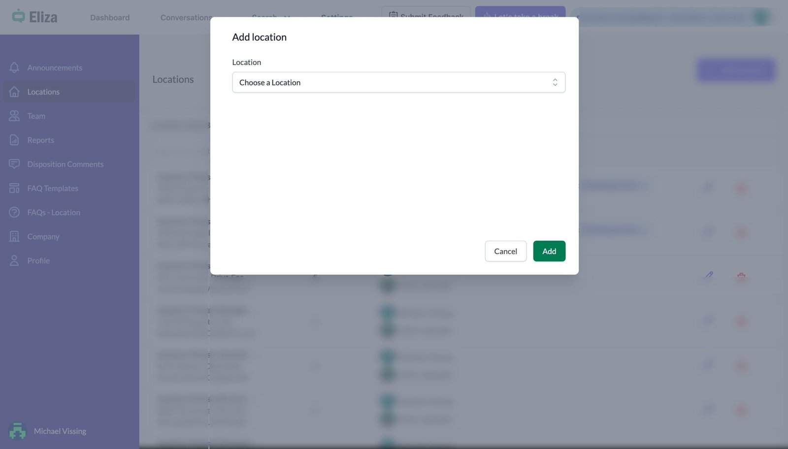 Using Eliza’s account starts with adding a location to the account.