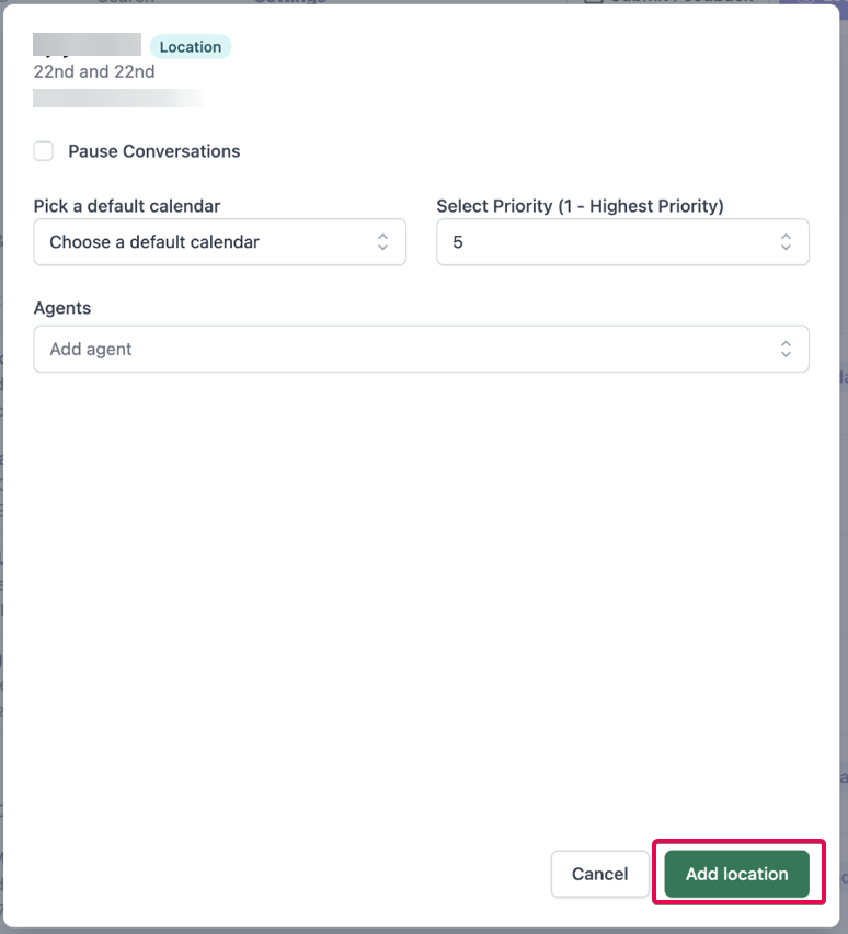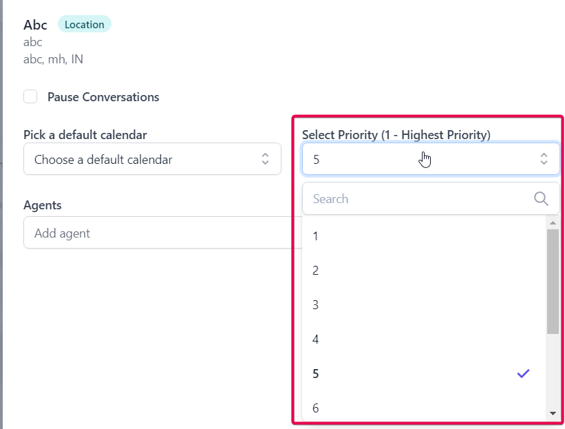 Once the Location is selected from the dropdown, it will show the screen where you need to choose an optional default calendar and set a priority.