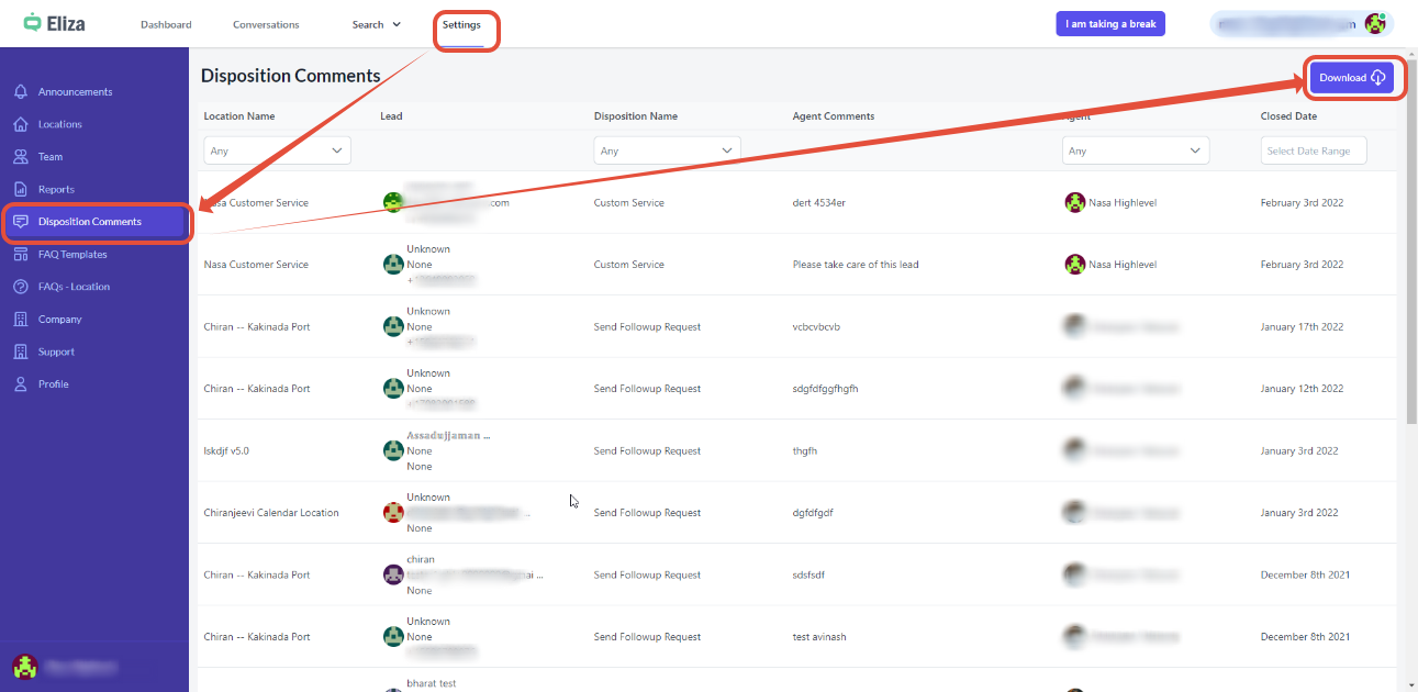 All the dispositions entered can be downloaded as an excel file using the download button at the top right corner for the chosen criteria, such as Location, Disposition name, and agent.