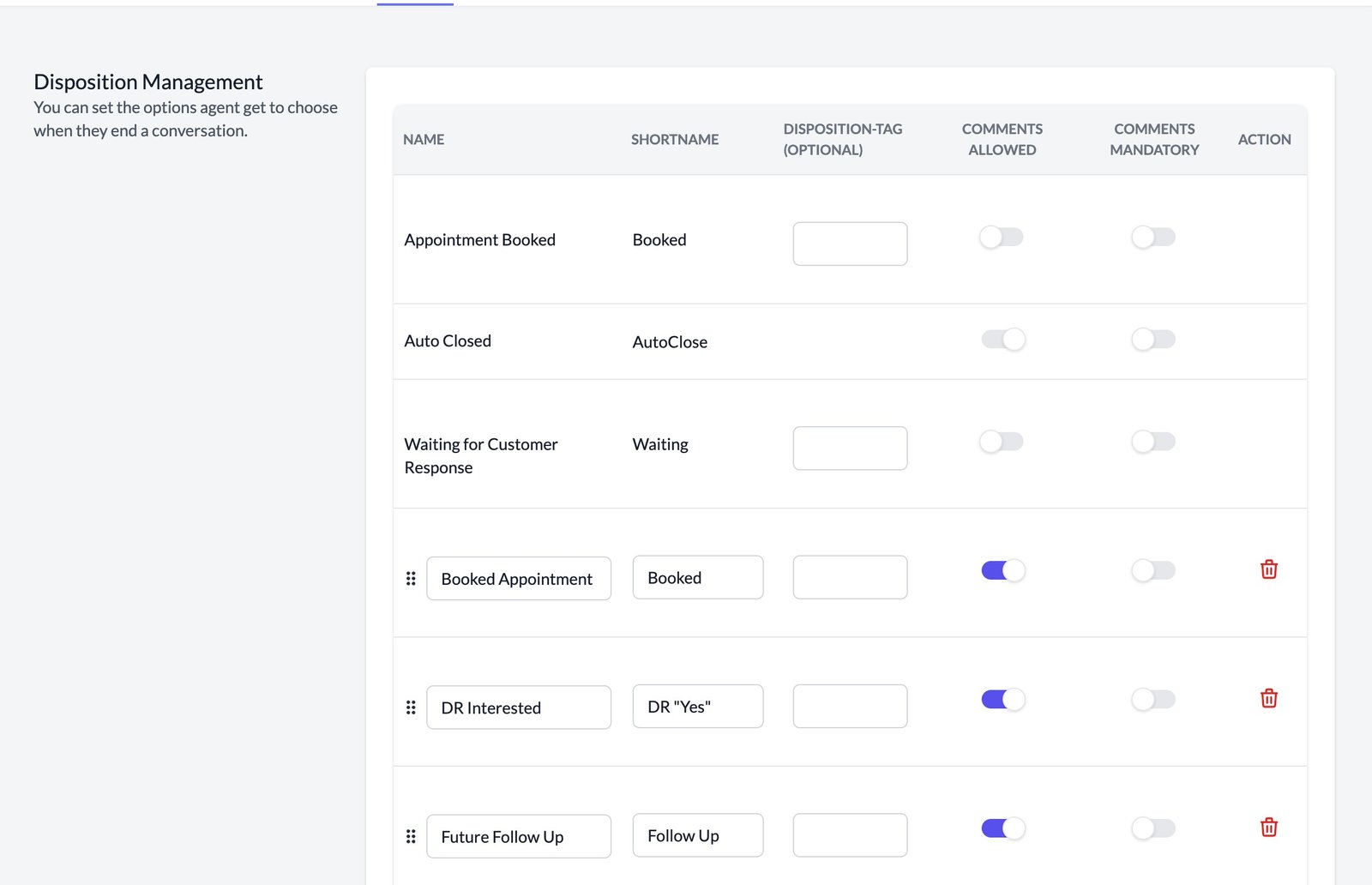 - Whether comments are allowed while assigning the disposition.