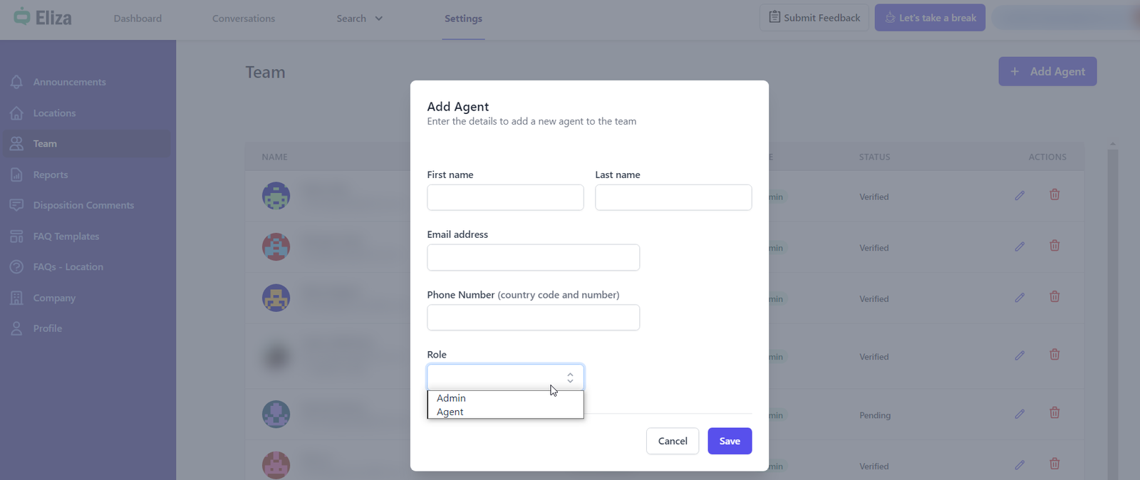 On Settings > Team screen, you can add team members as agents or admins.