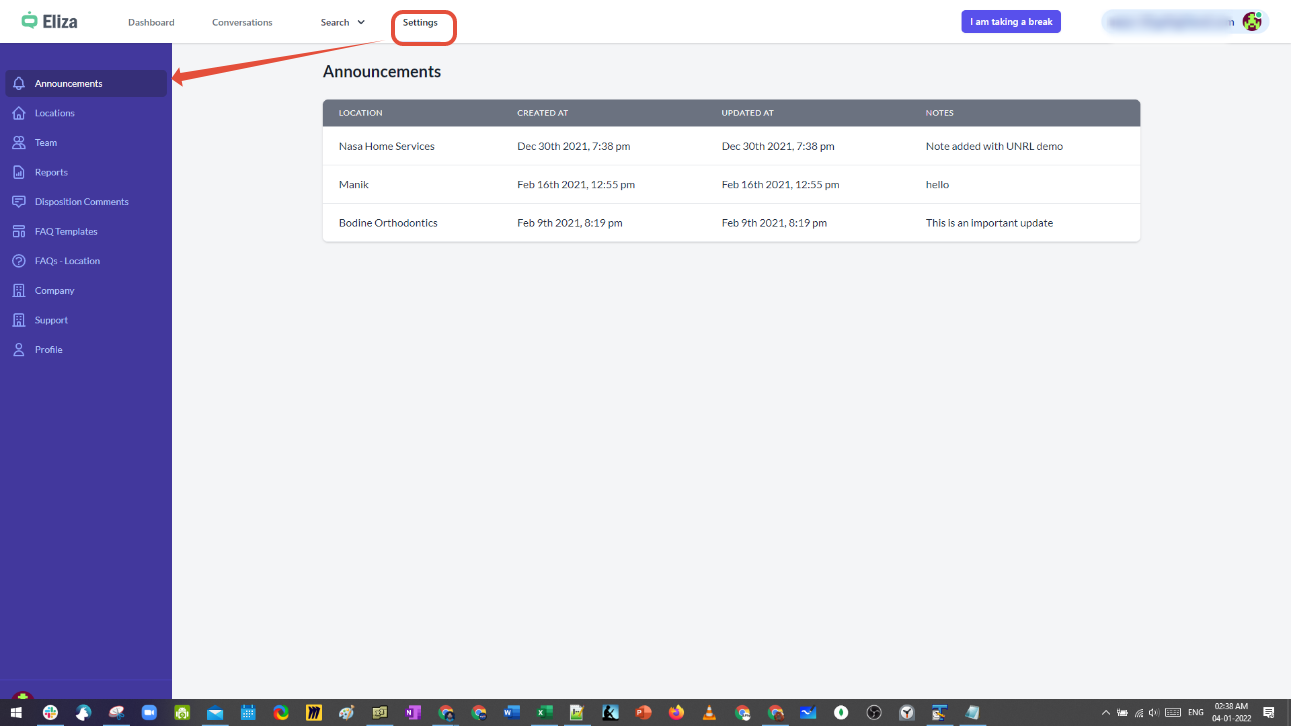 Announcements are available only for those agents assigned to work on this Location.