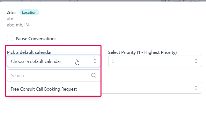 Once the Location is selected from the dropdown, it will show the screen where you need to choose an optional default calendar and set a priority.