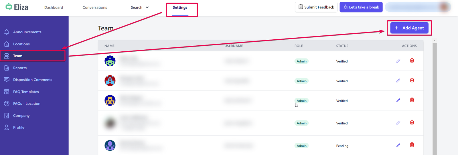 On Settings > Team screen, you can add team members as agents or admins.