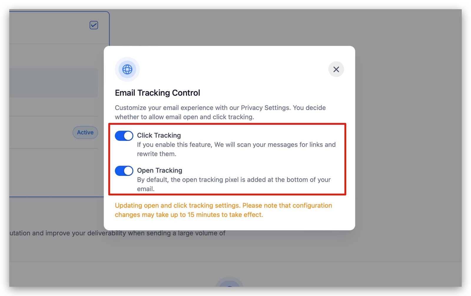 Once you click on DOMAIN SETTINGS, you’ll see a popup on the screen with the option to enable or disable email tracking.