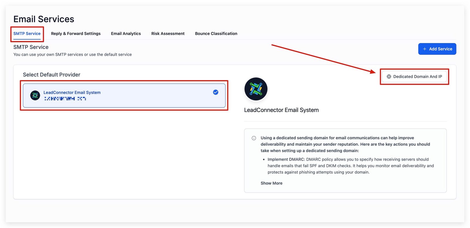 Navigate to the EMAIL SERVICES tab in your sub-account settings, make sure you have your LC Email selected, then click the button that reads DEDICATED DOMAIN AND IP.