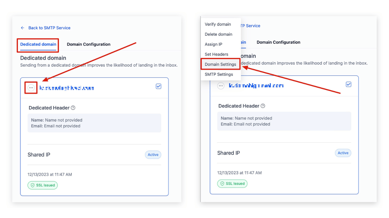 You’ll see a small button with three dots located in the top left corner of your LC Email dedicated sending domain. Click that button to see some different options related to your LC Email dedicated sending domain. The option you’ll need to select is titled DOMAIN SETTINGS.