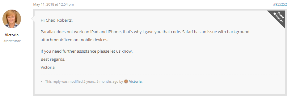 Parallax images or also known as Fixed background images do not properly work on iPhones and iPad. This is a limitation by iOS which blocks the Javascript for this animation. This works perfectly on Android phones or tablet, chrome book and Windows tablets.