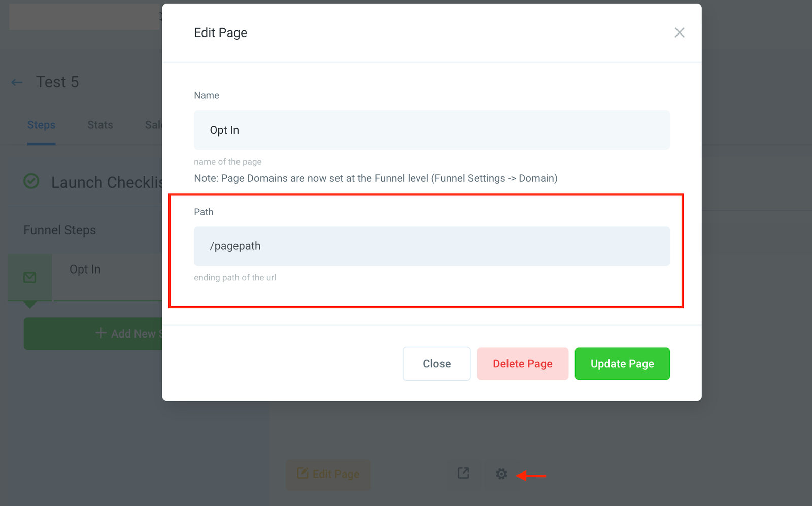 - We currently can only have one page within a step. Once the A/B testing is launched, you will be able to configure the traffic based on the URL for each page. It can be configured from the Gear icon beside the Edit page button which opens the Settings modal for the page.